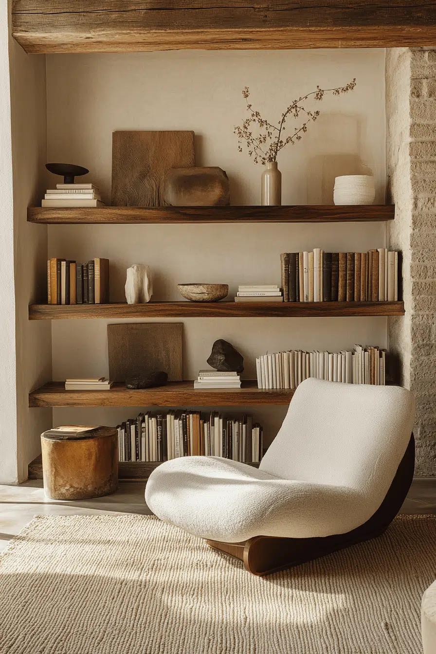 A hand-finished pine shelf introduces natural warmth into an antique bookshelf arrangement. Visible grain patterns and subtle knots highlight artisanal construction. It pairs beautifully with woven baskets, pottery, and well-loved novels. The understated design allows surrounding decor to shine. Within an antique bookshelf styling plan, simplicity can feel profoundly authentic. Tap to layer your walls with rustic heritage charm!