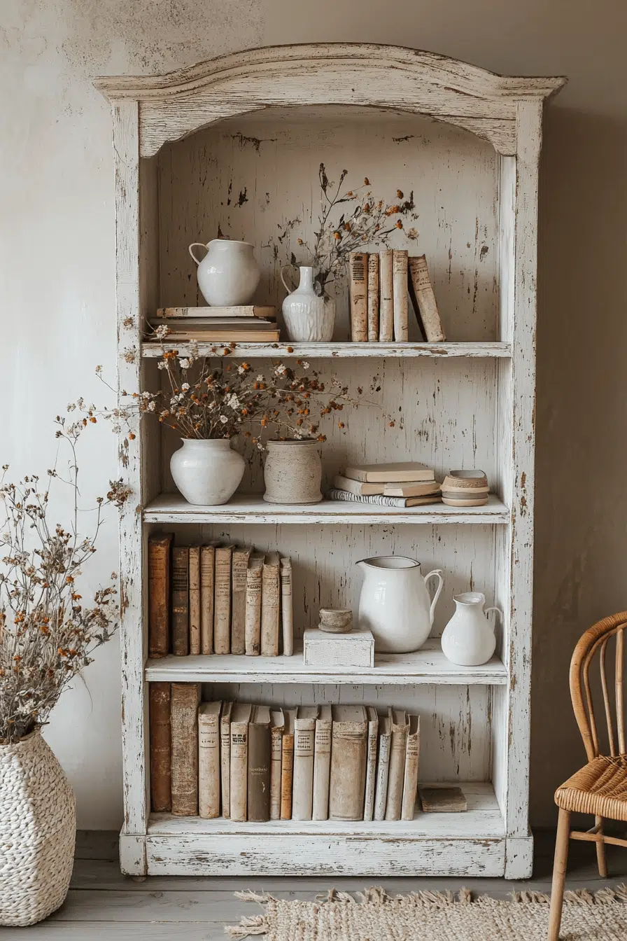 A chalky white weathered bookcase brightens an antique bookshelf composition with effortless vintage charm. The lightly chipped finish reveals hints of history beneath each layer of paint. Open shelving offers generous space for ceramics, treasured heirlooms, and curated stacks of books. Its neutral tone makes mixing woods and textiles seamless and inviting. In an antique bookshelf setting, this piece feels nostalgic yet refreshingly light. Tap to create a luminous vintage display!