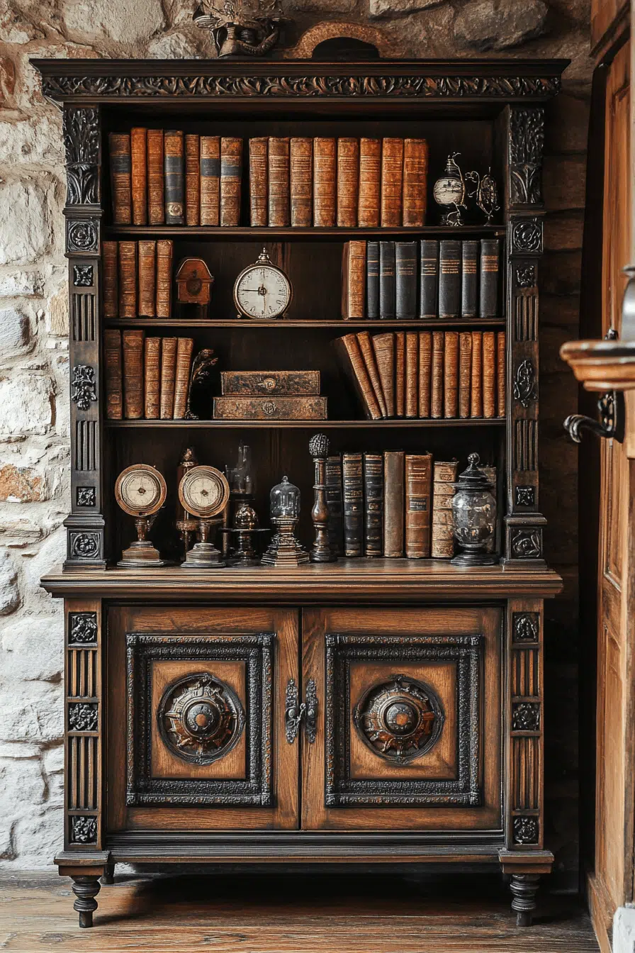 A Jacobean-inspired cabinet bookcase adds weight and history to an antique bookshelf display. Geometric carvings and twisted columns reflect Old World craftsmanship. Deep wood tones anchor the room with commanding presence. Its sturdy shelving accommodates books, artifacts, and statement decor. An antique bookshelf anchored by bold detailing feels rich and grounded. Click to bring Tudor-inspired depth into your interior!
