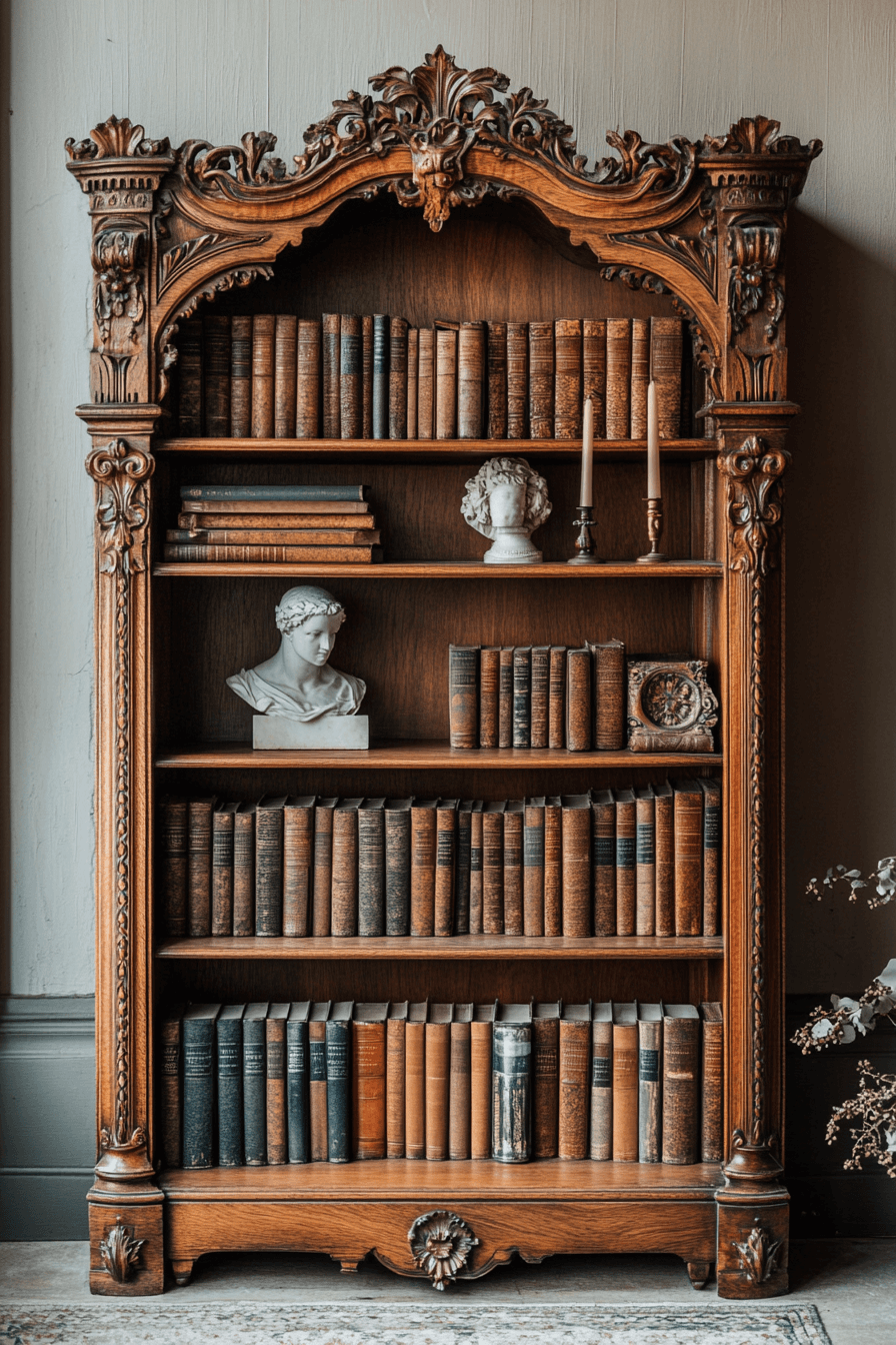 A Baroque-inspired display niche transforms an antique bookshelf corner into a theatrical escape. Elaborate carvings and gilded flourishes frame treasured volumes. Rich finishes and scrolling motifs amplify the room’s opulence. Styled with tufted seating nearby, it becomes a dramatic reading retreat. An antique bookshelf accented with ornate details radiates classic luxury. Tap to indulge in decorative grandeur!