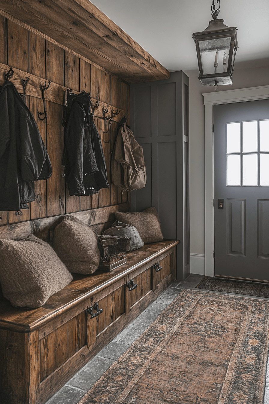 Design a cozy boot room inspired by antique farmhouse decor ideas that combine practicality and charm. Sturdy hooks, wooden benches, and wicker baskets add structure while maintaining warmth. Scuffed finishes and muted colors bring character to the everyday. It’s where comfort meets craftsmanship.