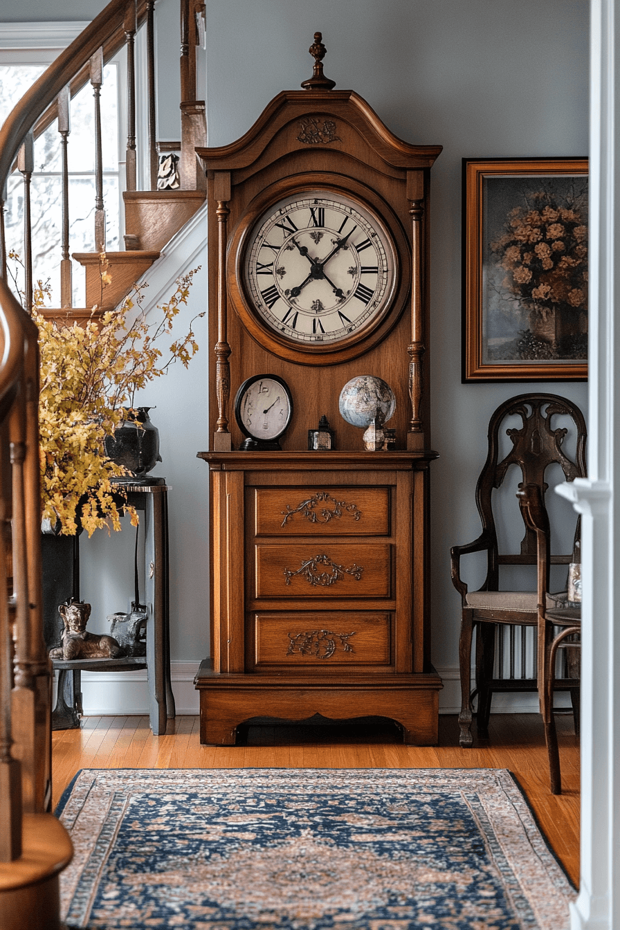Celebrate craftsmanship and heritage with a tall grandfather clock—an icon among antique farmhouse decor ideas. Its rhythmic chime fills the home with peaceful nostalgia. Polished wood and graceful details make it both art and memory. The sound alone adds rhythm to daily life.