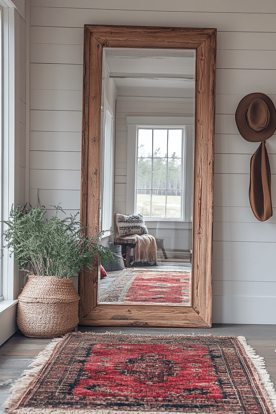 Brighten your space with reflective beauty using antique farmhouse decor ideas featuring weathered mirrors. Their distressed frames add texture and charm, amplifying the room’s natural light. Each reflection reveals a blend of old and new. The look feels warm, soft, and sophisticated.