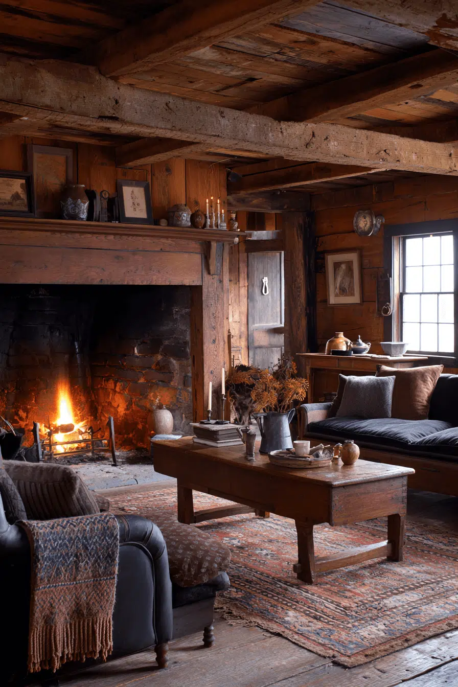 Strength and tradition define a Tudor-inspired antique living room grounded in historic character. Dark wood paneling and substantial fireplaces establish architectural presence. Heavy textiles and carved furniture reinforce the medieval aesthetic while adding comfort. Deep, earthy color palettes create a cozy and enveloping environment. The room feels enduring, secure, and full of heritage. Bring Tudor warmth into your living room and embrace old-world richness.