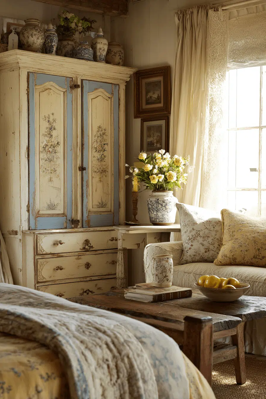 Relaxed elegance defines a French Provincial antique living room rooted in countryside charm. Painted furniture, floral textiles, and distressed finishes create warmth and authenticity. Linen upholstery and curved wooden frames invite comfort. Rustic lighting and open shelving add character without formality. The space feels casual yet graceful. Bring French Provincial ease into your living room and enjoy timeless charm.