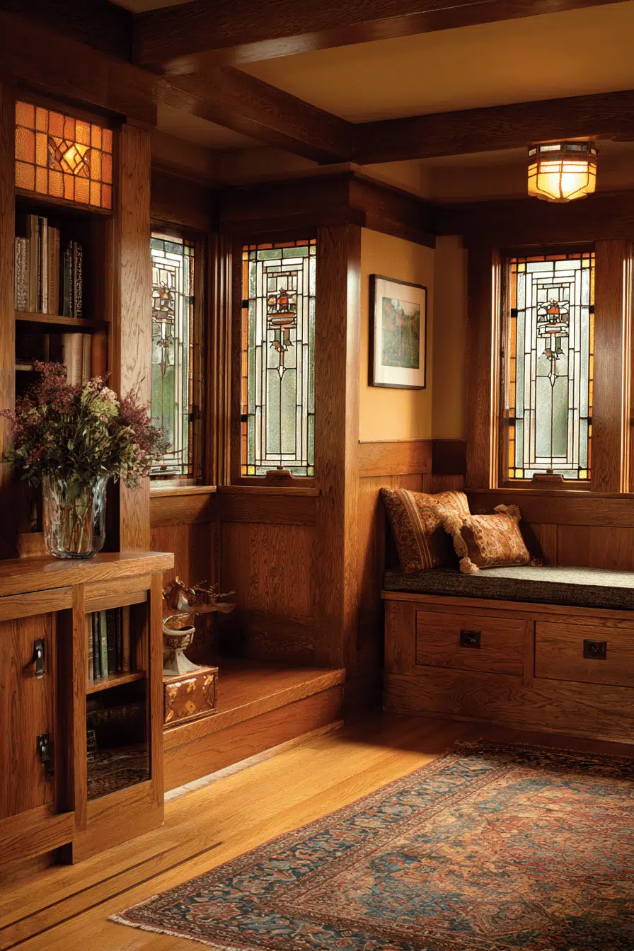 Honest craftsmanship anchors a Craftsman-inspired antique living room designed for warmth and purpose. Handcrafted wood furnishings, built-in shelving, and stained glass details establish character. Earthy tones highlight natural materials throughout the space. Every element feels intentional and durable. The room encourages relaxation and connection. Wrap your living room in Craftsman quality and enduring appeal.