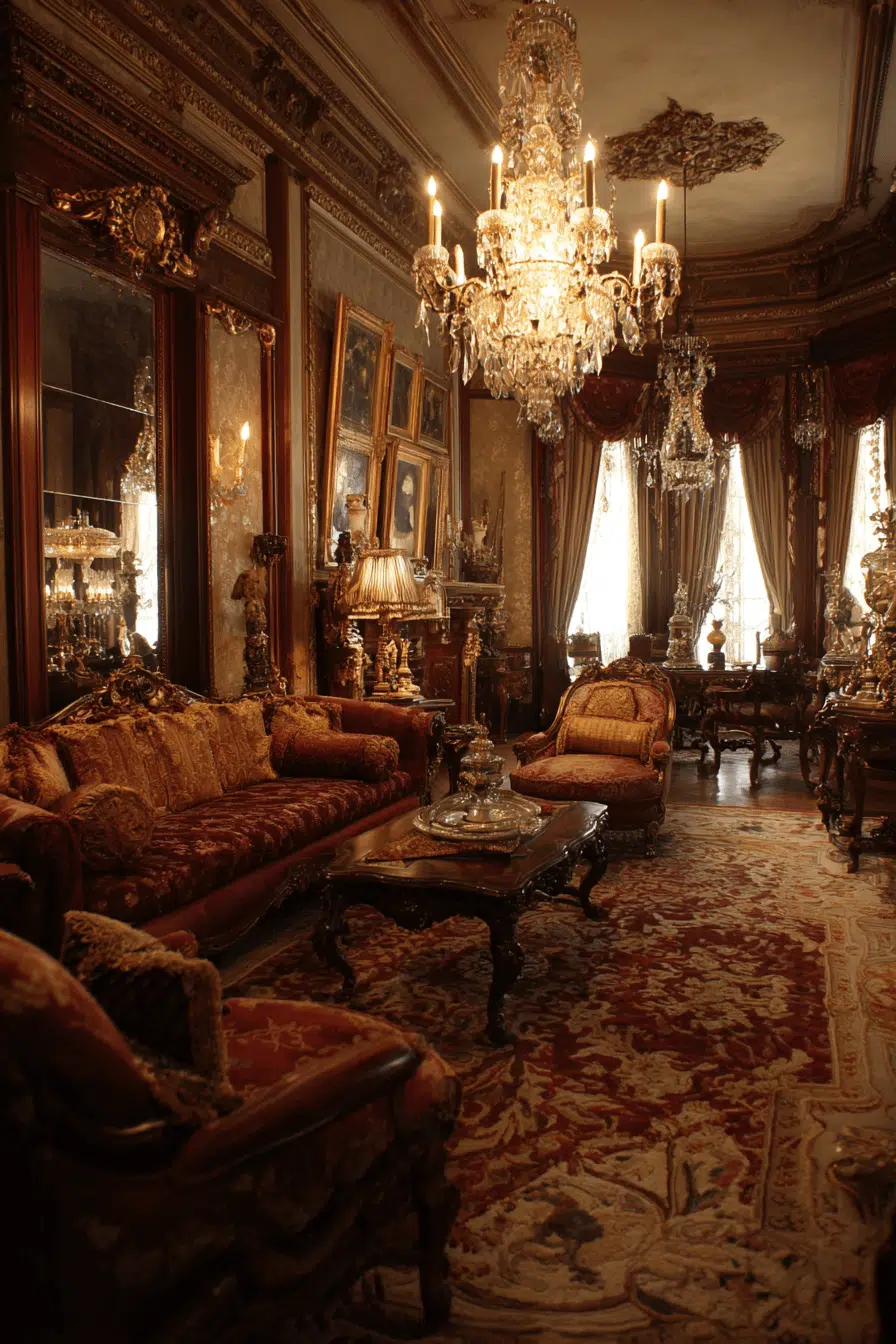 Lavish presentation transforms a Gilded Age antique living room into a showcase of refinement. Ornate paneling, plush seating, and oversized mirrors amplify visual richness. Sparkling chandeliers and decorative trim celebrate opulence. Every detail reflects confidence and status. The space feels celebratory and unforgettable. Create a Gilded Age living room and embrace unapologetic elegance.