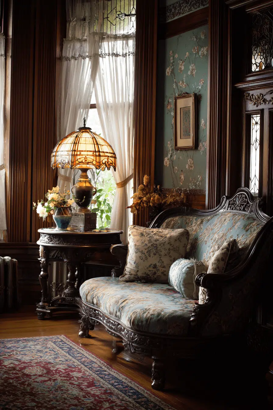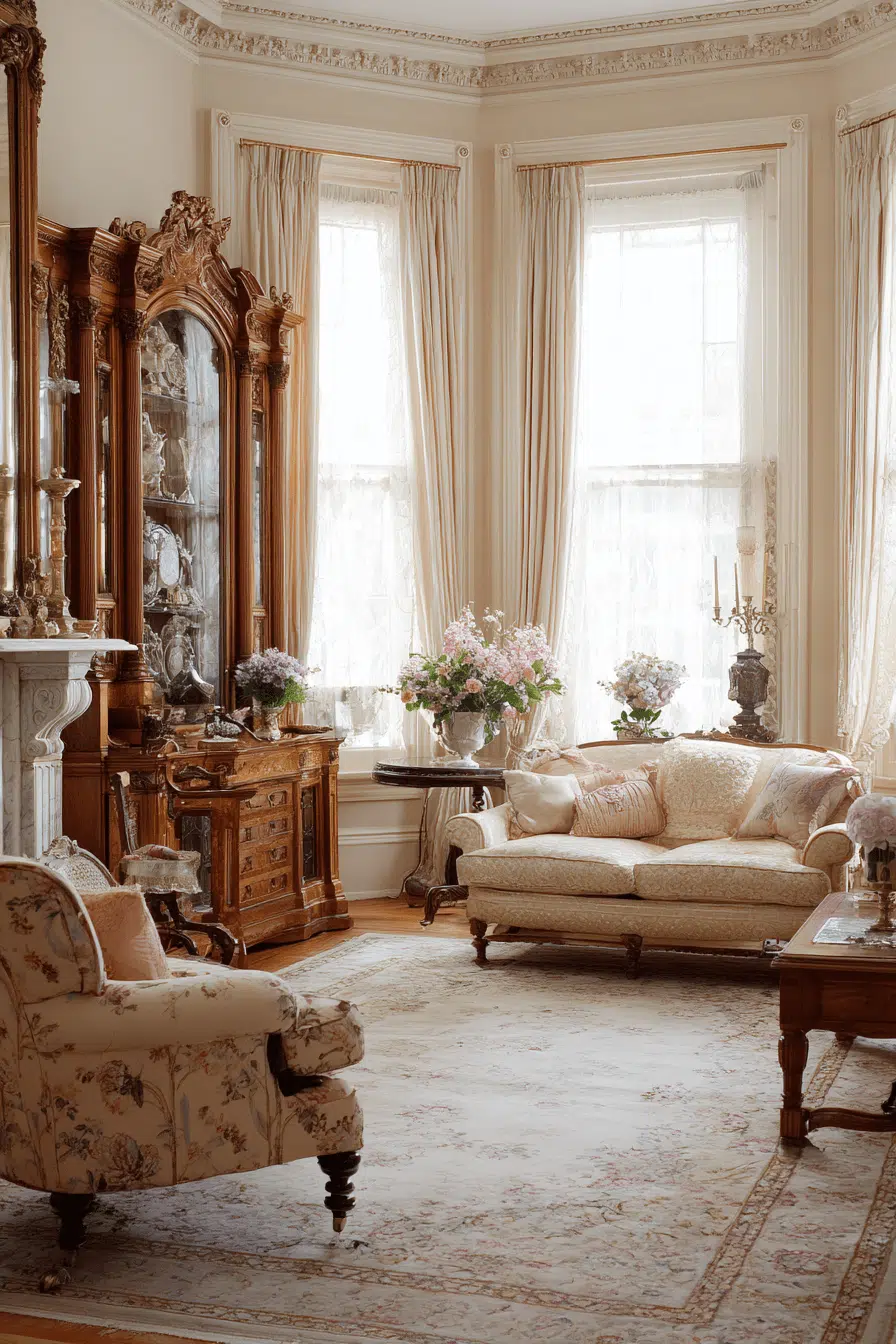 Layered elegance defines a Victorian-influenced antique living room where richness and ornamentation create an unmistakable sense of heritage. Deep-toned upholstery, carved wooden furnishings, and lace-accented textiles establish a luxurious yet welcoming atmosphere. Patterned walls and heavy drapery add visual depth while decorative objects such as porcelain figurines and antique candleholders reinforce old-world refinement. The room feels curated and expressive, designed to impress without feeling untouchable. Every element contributes to a space that celebrates beauty and history together. Let Victorian drama guide your living room into timeless sophistication.