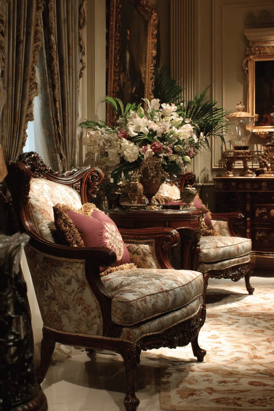 Ornamental beauty and dramatic flair shape a Baroque-inspired antique living room that feels theatrical yet inviting. Plush seating wrapped in velvet and gilded curves sets an opulent tone. Layered lighting enhances textures, carvings, and artwork throughout the space. Rich colors and expressive decor elements create visual movement without overwhelming the room. Despite its grandeur, the atmosphere remains warm and livable. Introduce Baroque influence and transform your living room into an artistic statement.