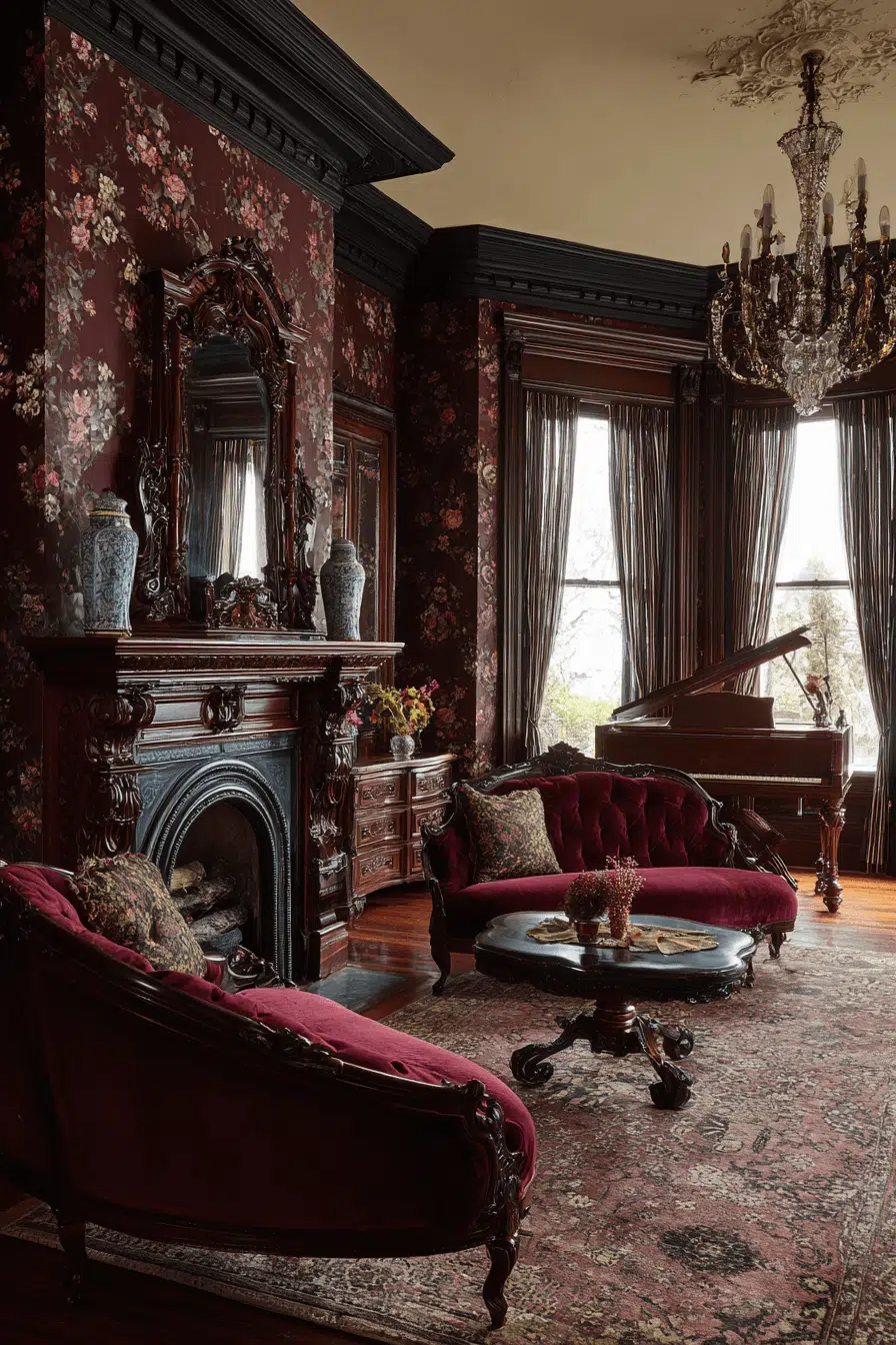 Layered elegance defines a Victorian-influenced antique living room where richness and ornamentation create an unmistakable sense of heritage. Deep-toned upholstery, carved wooden furnishings, and lace-accented textiles establish a luxurious yet welcoming atmosphere. Patterned walls and heavy drapery add visual depth while decorative objects such as porcelain figurines and antique candleholders reinforce old-world refinement. The room feels curated and expressive, designed to impress without feeling untouchable. Every element contributes to a space that celebrates beauty and history together. Let Victorian drama guide your living room into timeless sophistication.