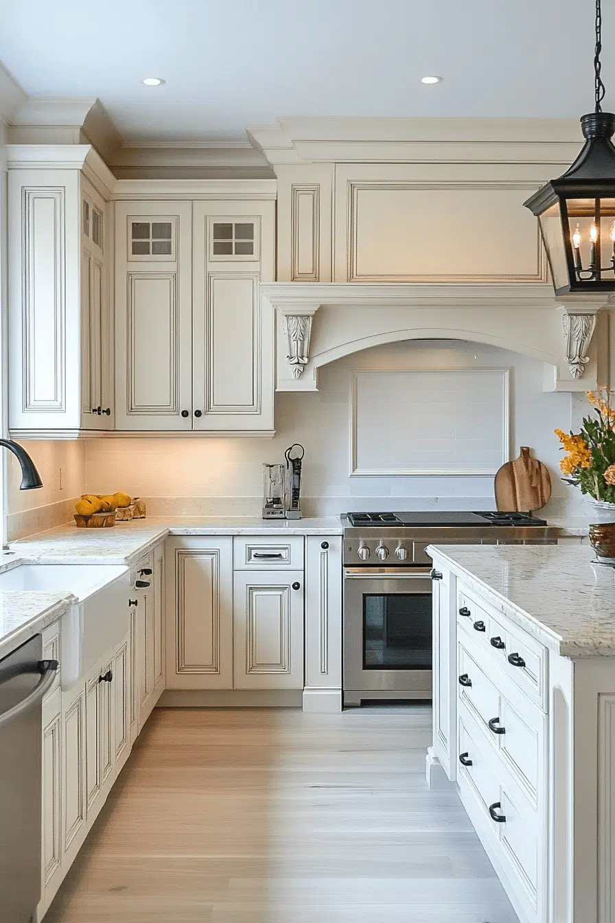 A polished atmosphere takes shape when antique white kitchen cabinets establish consistency throughout the kitchen. Their soft hue supports both traditional and modern elements effortlessly. Antique texture adds richness that elevates the overall design. Each feature feels connected and intentional. The space looks refined without excess. See more cohesive kitchen designs that feel timeless.