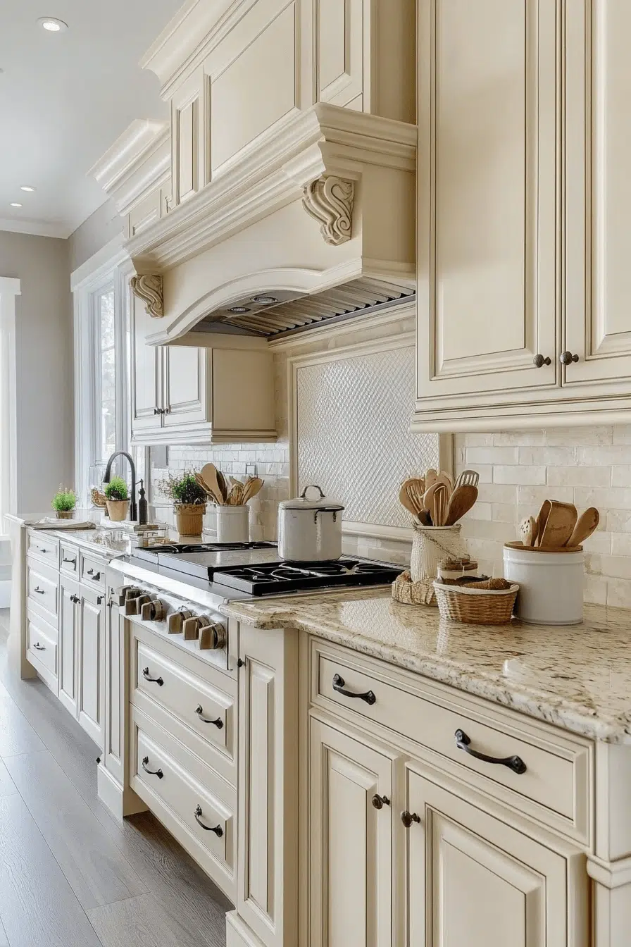 A soft, romantic aesthetic takes shape when antique white kitchen cabinets guide the design direction. Their light appearance adds an airy, almost dreamy quality. Antique detailing grounds the look with warmth and familiarity. Together, these elements create gentle visual interest. The space feels memorable and comforting. Explore more dreamy kitchen styles today.