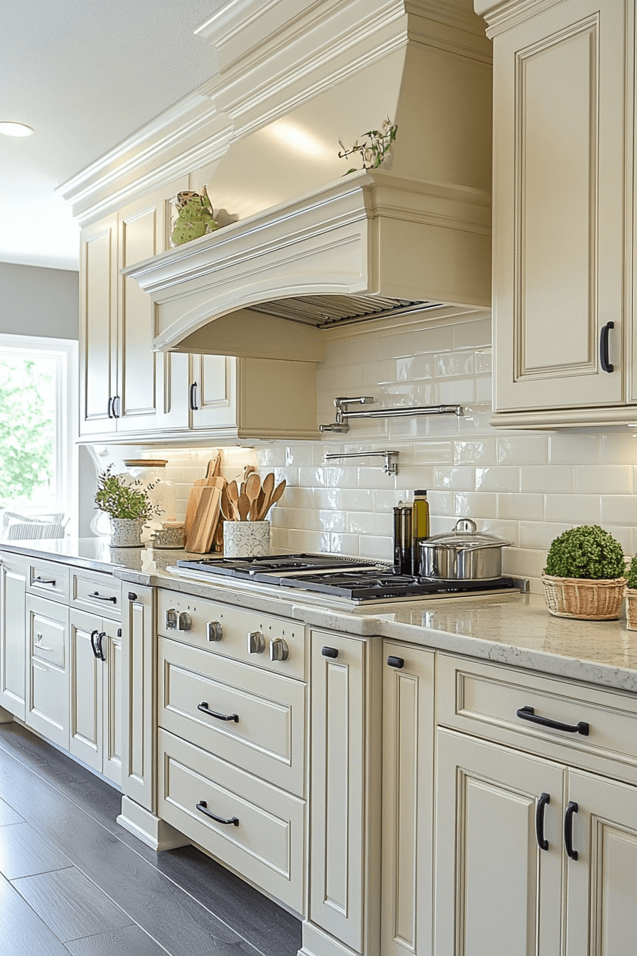 A polished atmosphere takes shape when antique white kitchen cabinets establish consistency throughout the kitchen. Their soft hue supports both traditional and modern elements effortlessly. Antique texture adds richness that elevates the overall design. Each feature feels connected and intentional. The space looks refined without excess. See more cohesive kitchen designs that feel timeless.