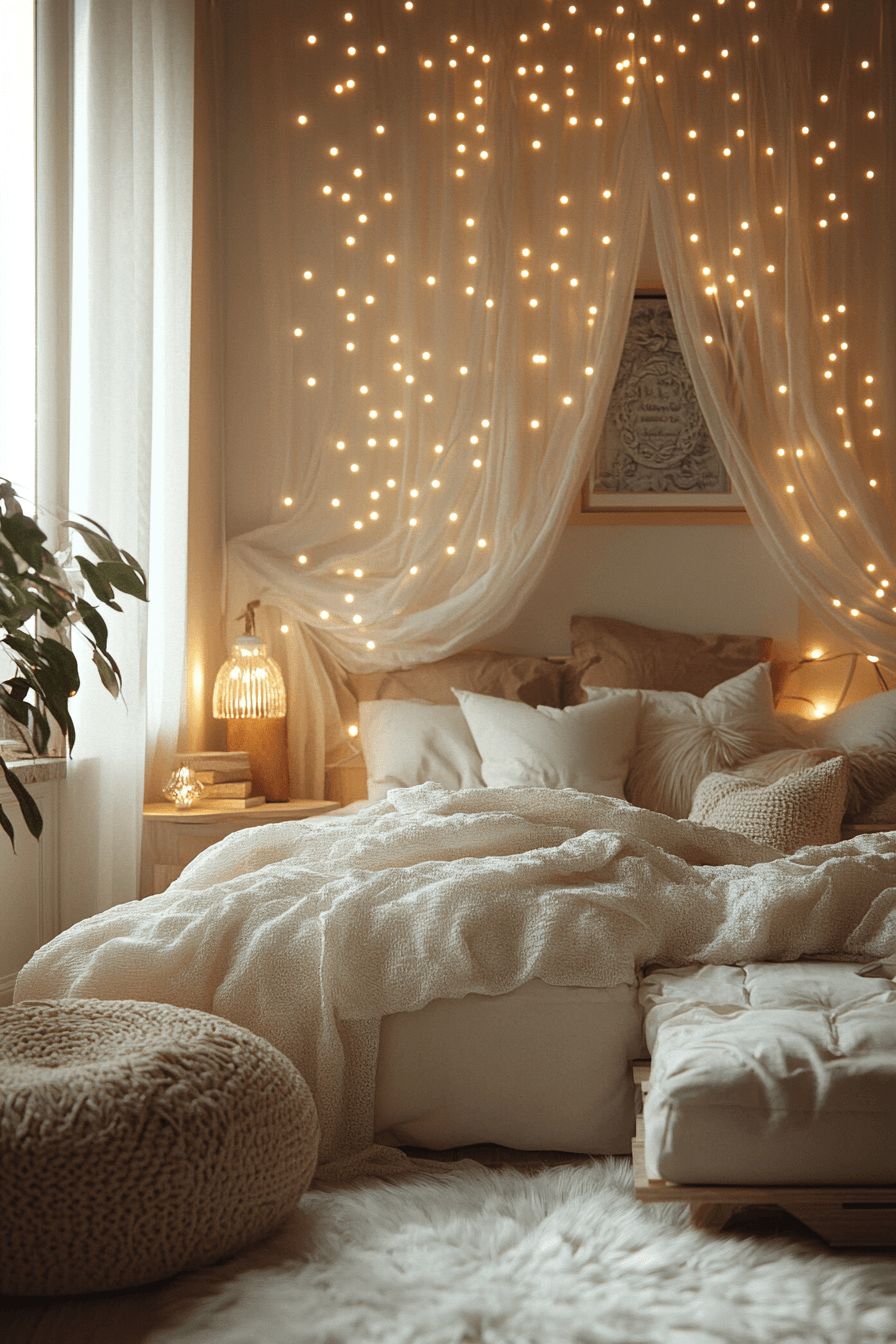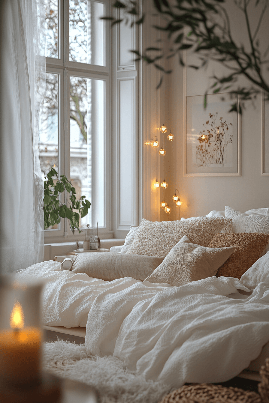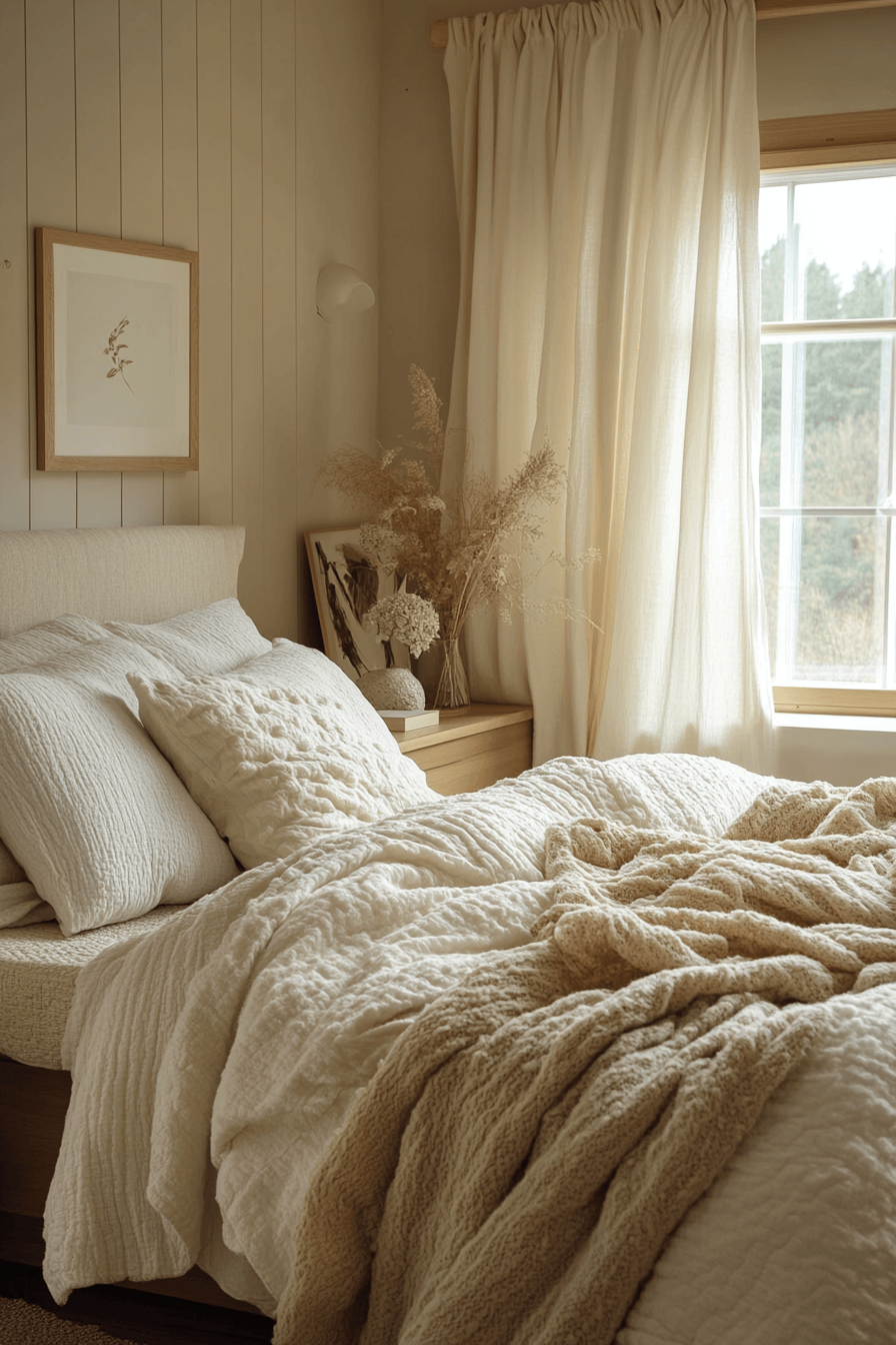 Cream and white hues blend together to form a dreamy, cloudlike escape. This apartment aesthetic cozy palette feels open and airy, perfect for unwinding. Plush fabrics and layered bedding add depth without heaviness. The simplicity keeps the look timeless and versatile.