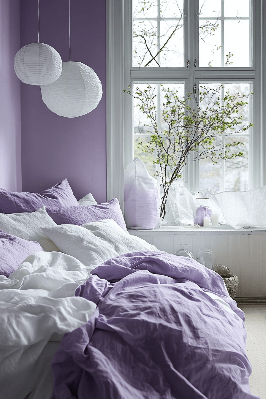 Lavender and white make for a calming and airy space that feels instantly uplifting. This apartment aesthetic cozy design uses soft purple accents to bring a gentle pop of color without overpowering the room. Light fabrics and sheer curtains keep the look fresh and open, perfect for brightening a small space. Minimal decor and clean lines maintain balance while letting the colors shine.