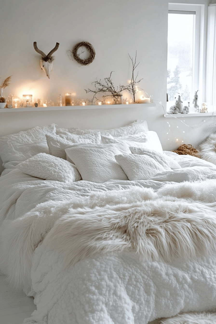 An all-white palette can still feel warm and inviting with the right touches. This apartment aesthetic cozy approach uses soft textures, varied materials, and layered fabrics to avoid flatness. Warm lighting, such as sconces and table lamps, adds depth and creates a soothing glow. Minimal accessories keep the space fresh, modern, and uncluttered while still feeling lived-in.