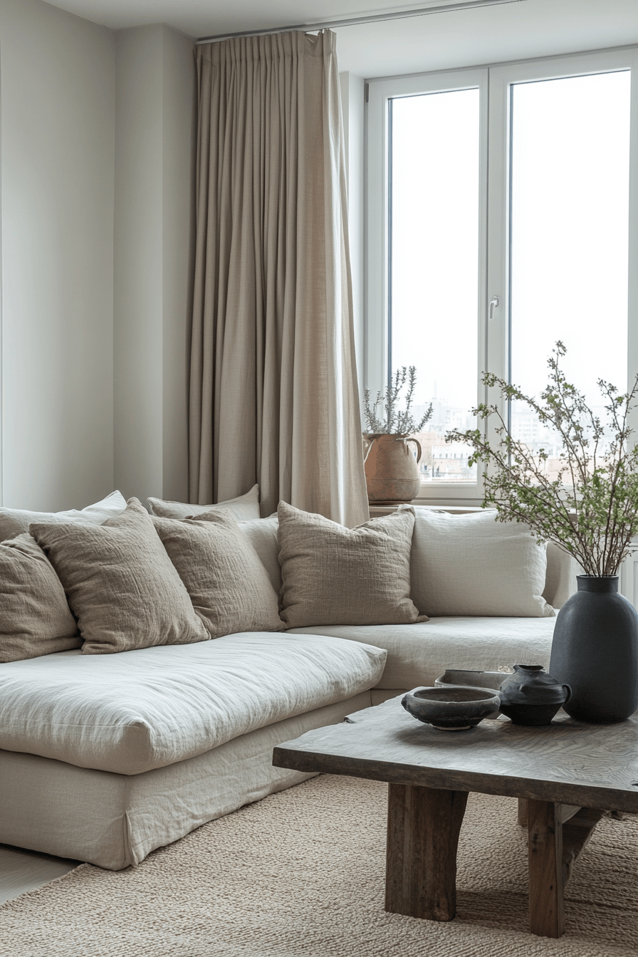 Soft pink paired with linen brings a warm and delicate touch that feels both feminine and timeless. This apartment aesthetic cozy combination is perfect for a relaxing retreat that still feels elegant. Natural materials like cotton, jute, and raw wood create texture and depth while keeping the palette light. Subtle decor accents such as ceramic vases or soft artwork keep the look uncluttered.