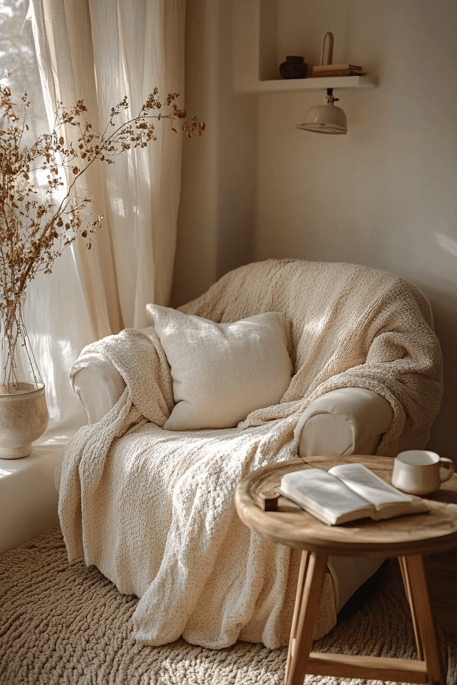 A calm corner is perfect for relaxing, reading, or simply enjoying a quiet moment. This apartment aesthetic cozy setup features plush seating layered with cushions and throws for extra comfort. Warm lighting creates an inviting ambiance at any time of day. Neutral colors keep the look timeless while small decorative accents add personality.