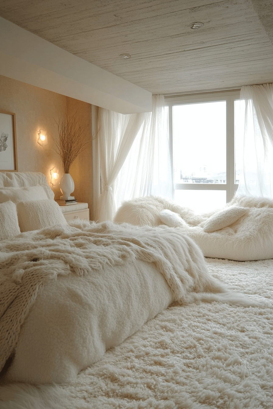 Plush textures and pale tones make for a relaxing retreat that feels indulgent yet understated. This apartment aesthetic cozy combination creates comfort without overwhelming the eye, offering the perfect space to recharge. Layered fabrics such as faux fur throws, knit blankets, and soft cushions bring depth and warmth. A neutral base keeps the style versatile, allowing for easy seasonal updates.