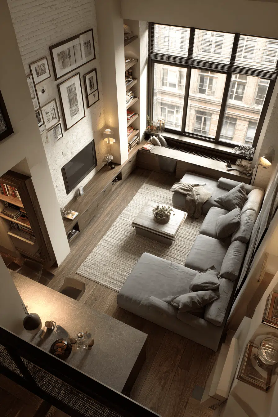 Urban loft energy captures confident apartment inspiration through simplicity and structure. Clean lines emphasize architecture. Neutral palettes maintain openness. The layout feels expansive and airy. Modern styling enhances urban character. Bring sleek loft vibes into your apartment today.