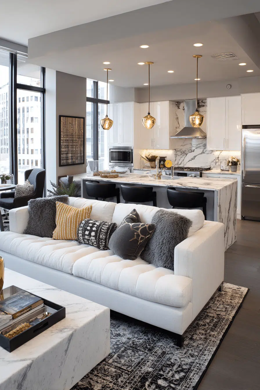 Contemporary city living offers bold apartment inspiration through sleek lines and confident contrast. Streamlined furniture anchors the layout while layered textures add softness. Neutral foundations keep the look cohesive. The balance between modern structure and comfort makes it livable. Architectural details become part of the design story. Channel this modern urban vibe into your apartment today.