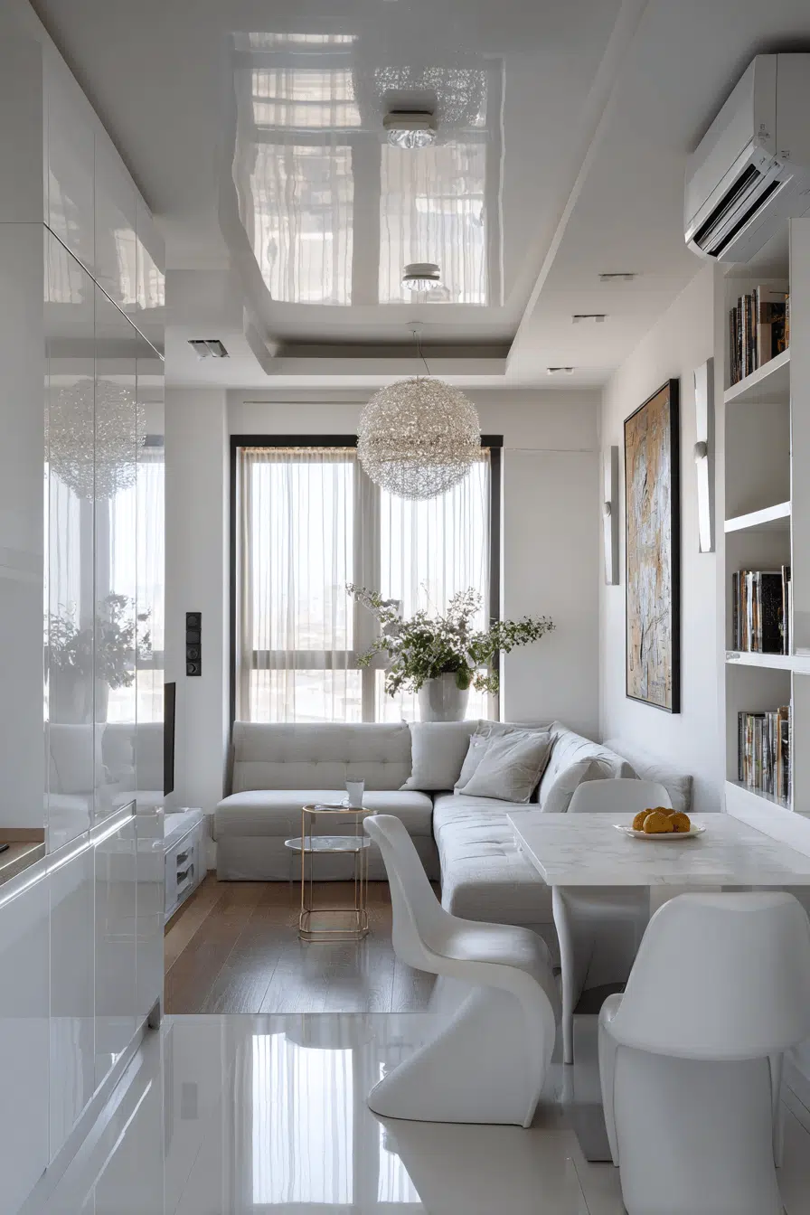 Sleek storage solutions anchor tailored apartment inspiration. Hidden compartments maintain a clutter-free exterior. Glossy accents subtly enlarge the room visually. Thoughtful placement ensures smooth movement. Every detail feels purposeful. Elevate your compact living experience now.