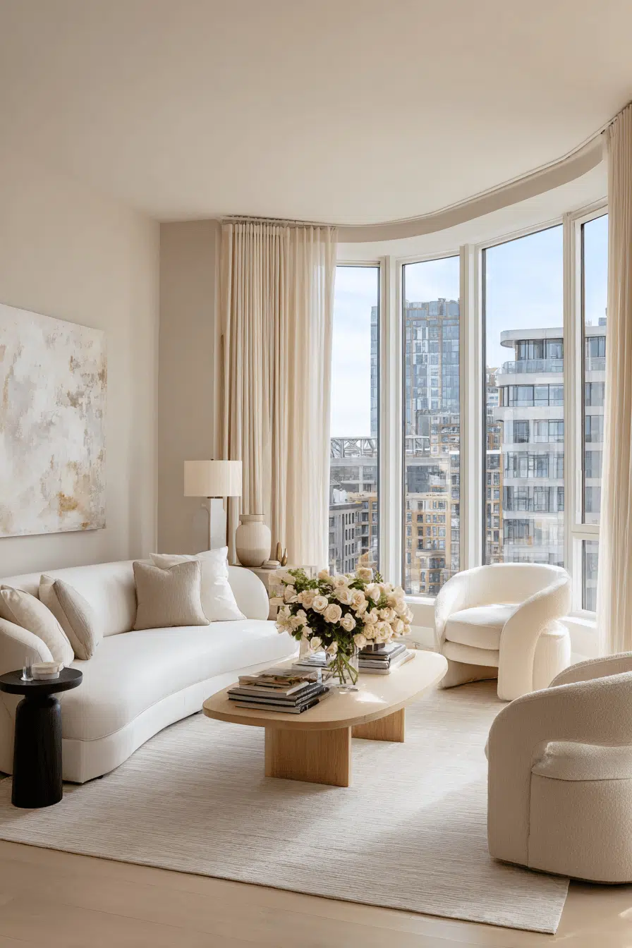 Curved silhouettes bring graceful movement into apartment inspiration. Rounded coffee tables and sculpted armchairs soften sharp corners. A restrained palette allows form to take center stage. Even a single curved piece can redefine the mood. The room feels fluid and visually interesting. Introduce sculptural shapes into your apartment today.