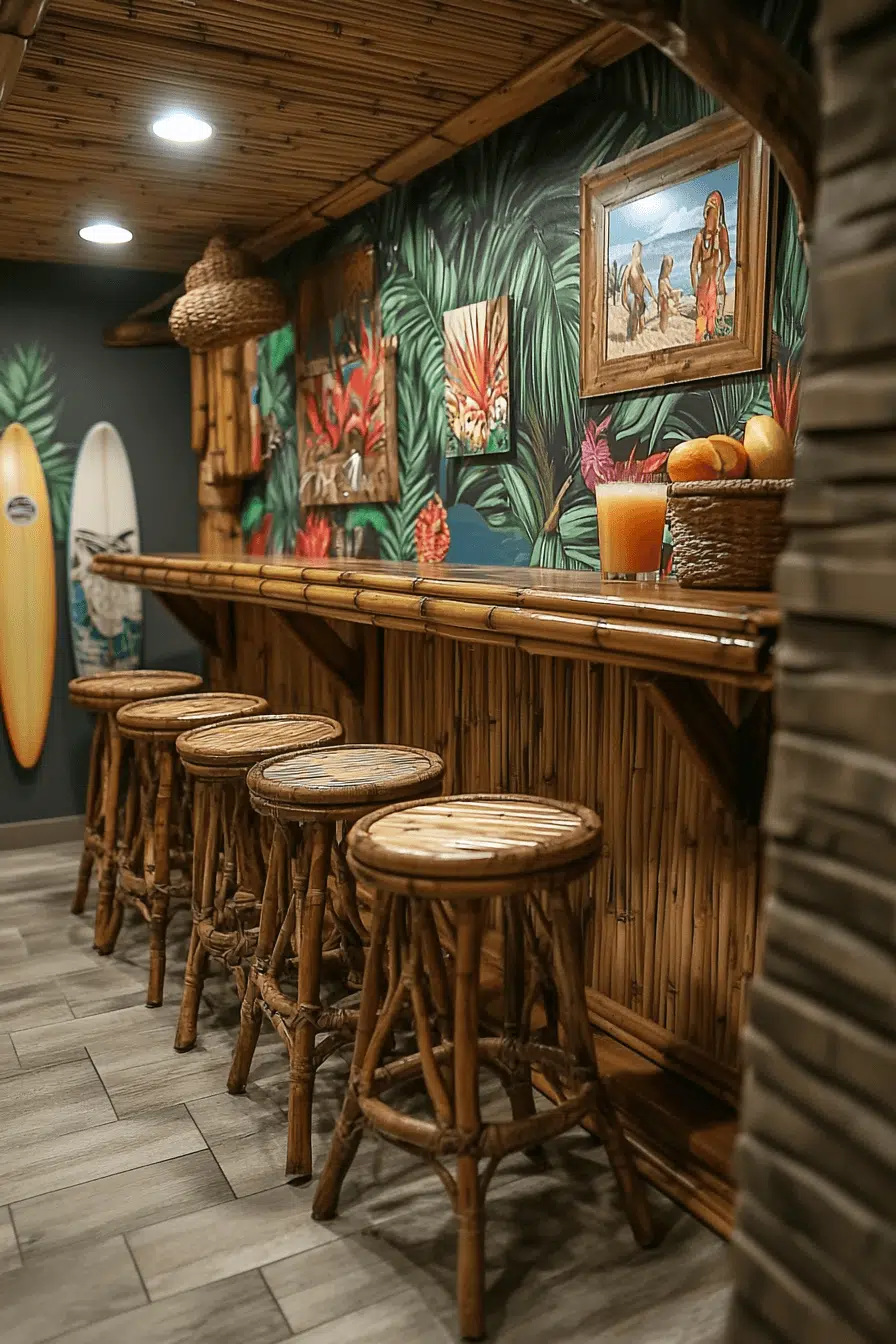 Vacation-inspired decor reshapes basement bar ideas into laid-back tropical escapes. Natural textures and playful accents bring warmth and energy. Soft lighting completes the relaxed atmosphere. The bar feels casual yet intentional. It is perfect for stress-free entertaining. Explore tropical basement bar ideas that capture island charm.