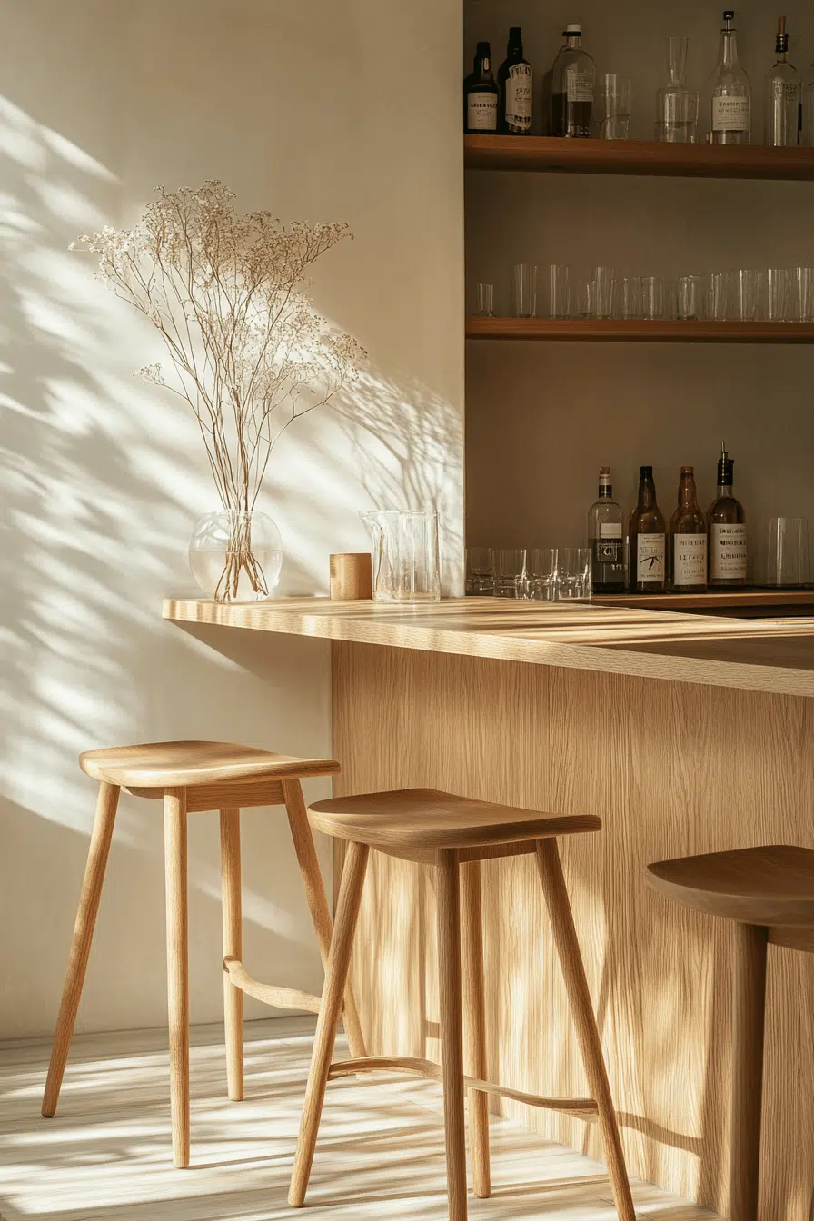Calm simplicity guides basement bar ideas rooted in Scandinavian design principles. Light finishes and organic textures keep the space welcoming. Clean lines ensure visual clarity and balance. Cozy details soften the minimal look. The result feels warm and functional. Discover Scandinavian basement bar ideas with relaxed charm.