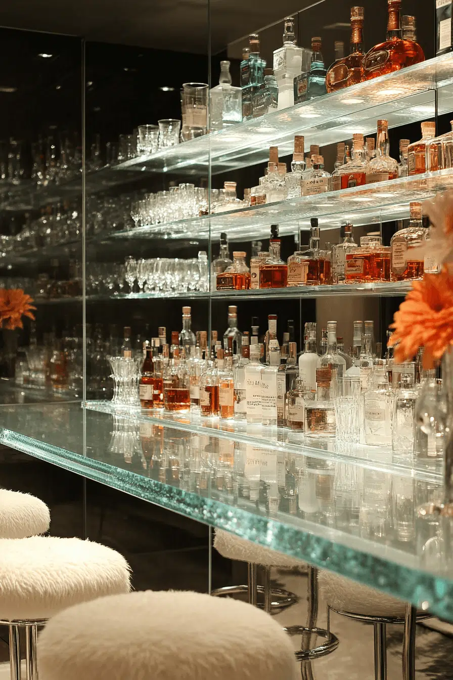 Light-reflective materials reshape basement bar ideas by opening up compact spaces visually. Glass shelving and mirrored walls create depth and brightness. Displayed bottles double as decor. The space feels expansive and glamorous. This design enhances visual impact. Explore mirror-focused basement bar ideas that shine.
