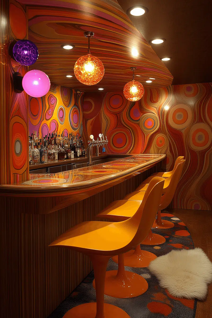 Nostalgic flair refreshes basement bar ideas inspired by mid-century and retro design. Bold patterns and playful furnishings energize the space. Vintage accessories add character and charm. Music and color create a lively atmosphere. The bar feels expressive and fun. Explore retro basement bar ideas with joyful personality.