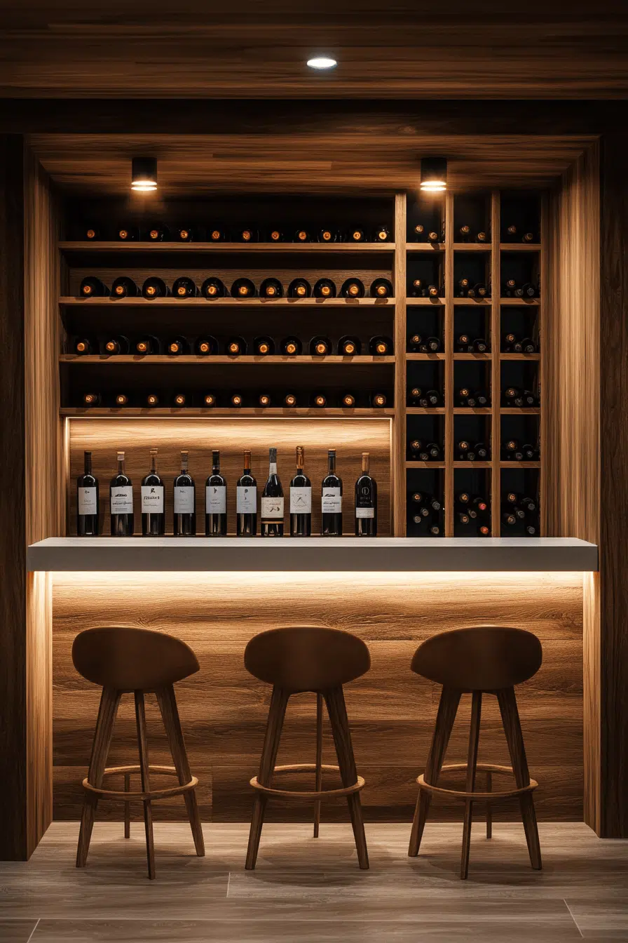 Modern elegance defines basement bar ideas that focus on sharp lines, polished surfaces, and a restrained color palette. High-gloss finishes and reflective details help the space feel elevated and intentional. Carefully layered lighting enhances the sleek atmosphere without overwhelming the design. The bar feels equally suited for entertaining or unwinding. Every element contributes to a refined lounge experience. Discover sleek basement bar ideas that bring modern luxury home.
