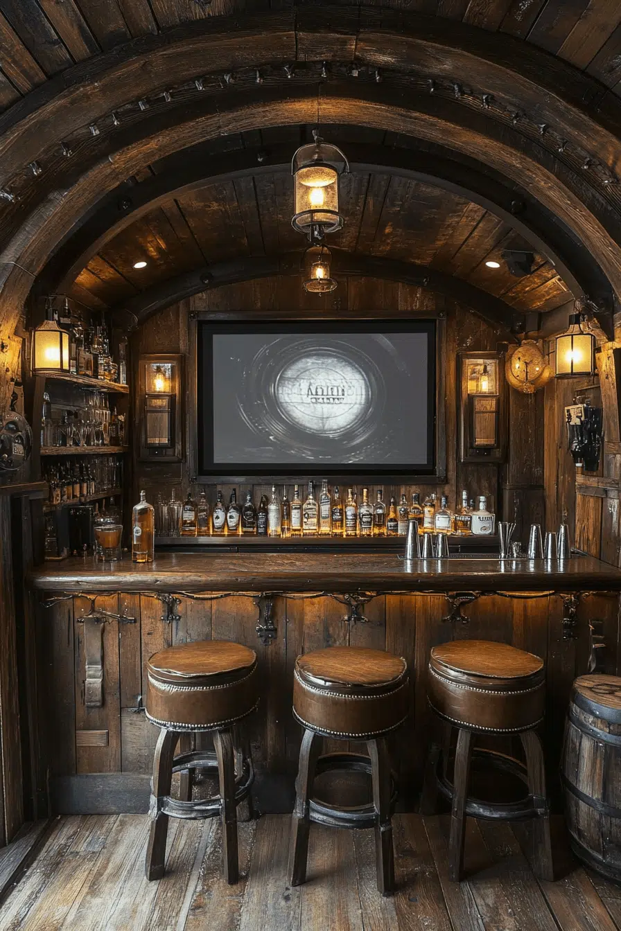 Entertainment-driven styling reimagines basement bar ideas with cinematic inspiration. Decorative elements reference classic movie culture. Snack and drink stations improve convenience. The space feels playful and immersive. It enhances every movie night. Discover cinema-themed basement bar ideas built for fun.