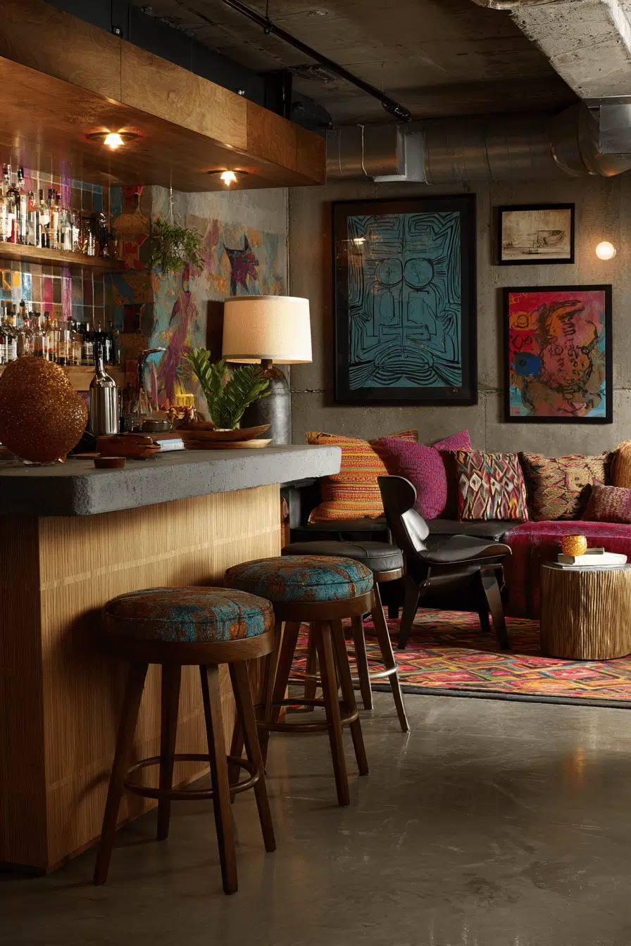Artistic expression reshapes basement bar ideas through bohemian influences. Layered textures and relaxed seating encourage creativity. Soft lighting enhances comfort and warmth. The space feels welcoming and personal. It reflects individuality. Discover boho basement bar ideas full of free-spirited charm.