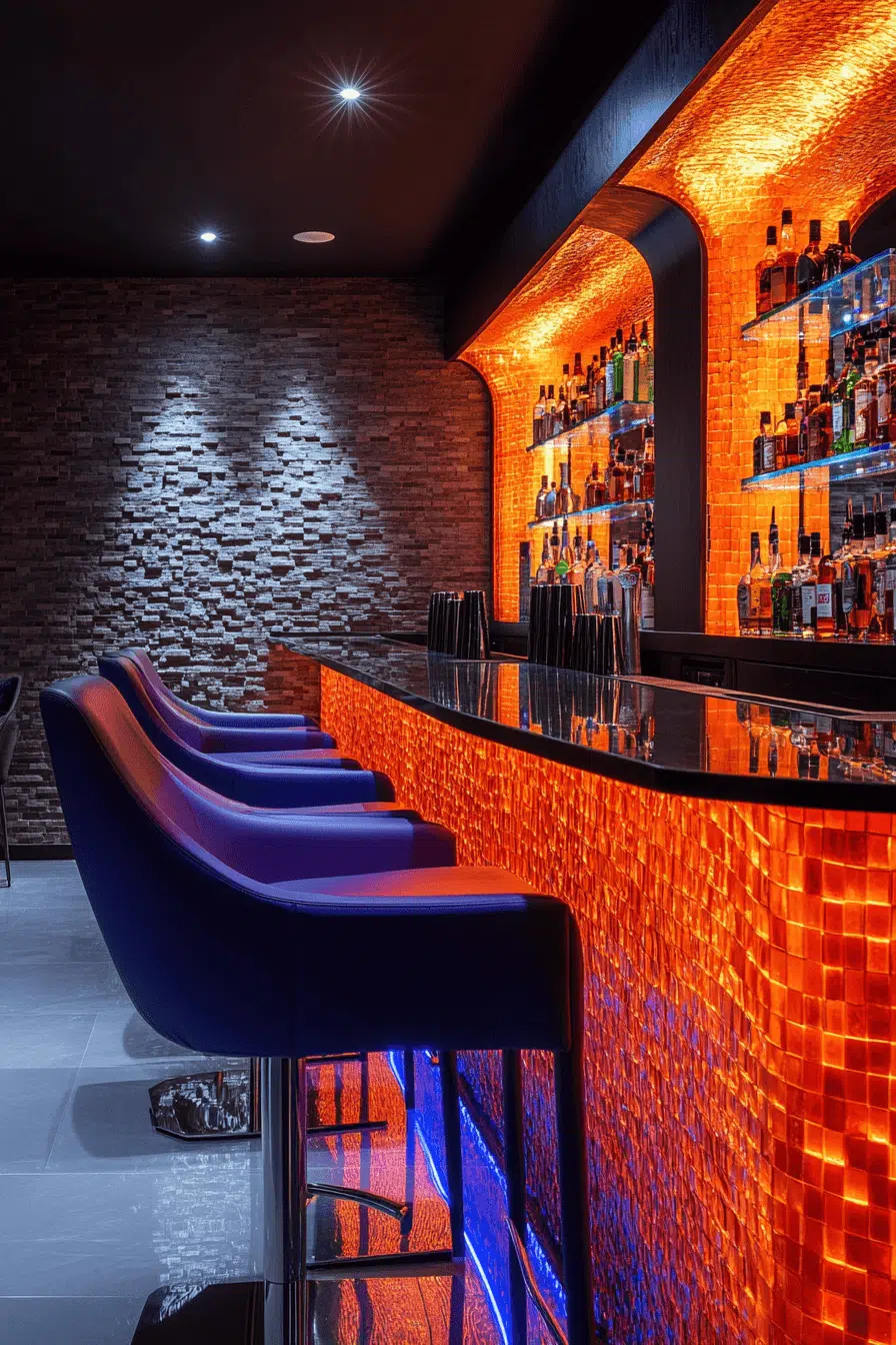 High-energy layouts redefine basement bar ideas by emphasizing movement, color, and interaction. Bold design choices keep the space visually engaging without sacrificing flow. Statement shelving and layered lighting set a lively tone. The bar becomes a focal point for social gatherings. Everything feels dynamic and intentional. Explore contemporary basement bar ideas built for entertaining.