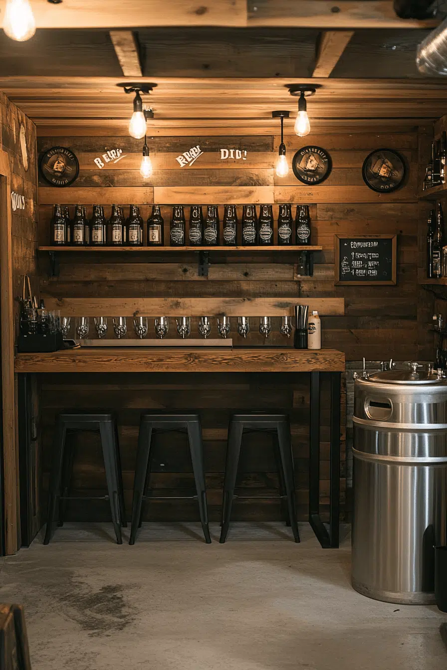 Functional creativity shines through basement bar ideas designed around home brewing and craftsmanship. Industrial materials provide durability while enhancing visual interest. Hands-on features encourage experimentation and personalization. The bar becomes both a workspace and social hub. This design celebrates passion and practicality. Discover home brewery basement bar ideas that invite creativity.