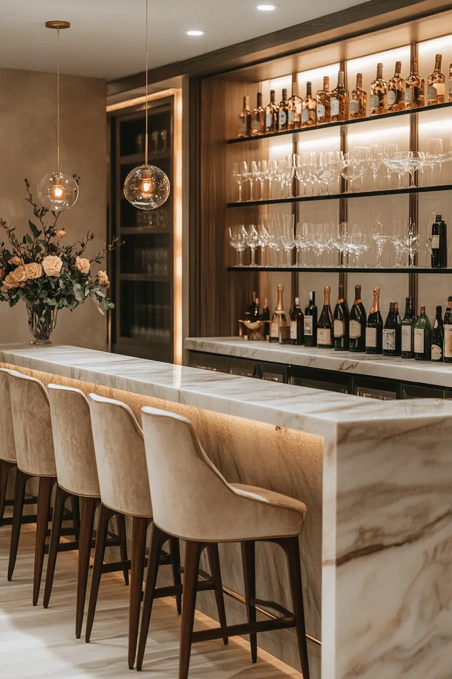 Sophisticated finishes elevate basement bar ideas focused on cocktail culture and refined hosting. Glossy countertops and elegant seating create a polished setting. Soft lighting enhances the mood without overpowering the design. The space feels curated and upscale. Every detail supports a luxurious experience. Explore chic basement bar ideas that elevate entertaining.