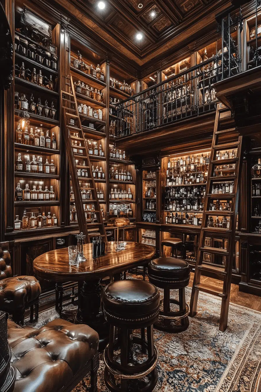 Bold glamour defines basement bar ideas inspired by Gatsby-era luxury. Dramatic materials and strong contrasts create visual impact. Art Deco details add rhythm and elegance. The space feels celebratory and refined. It is ideal for hosting. Explore Gatsby-inspired basement bar ideas that impress.