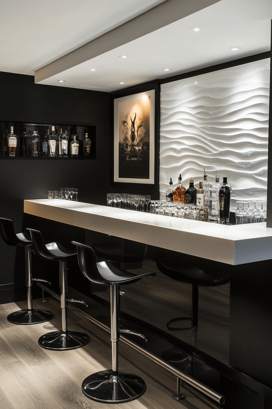 Sculptural simplicity refines basement bar ideas built on monochrome modernism. High-contrast palettes sharpen visual focus. Artistic furniture elevates the design. The space feels intentional and contemporary. Minimalism takes center stage. Discover monochrome basement bar ideas with modern edge.