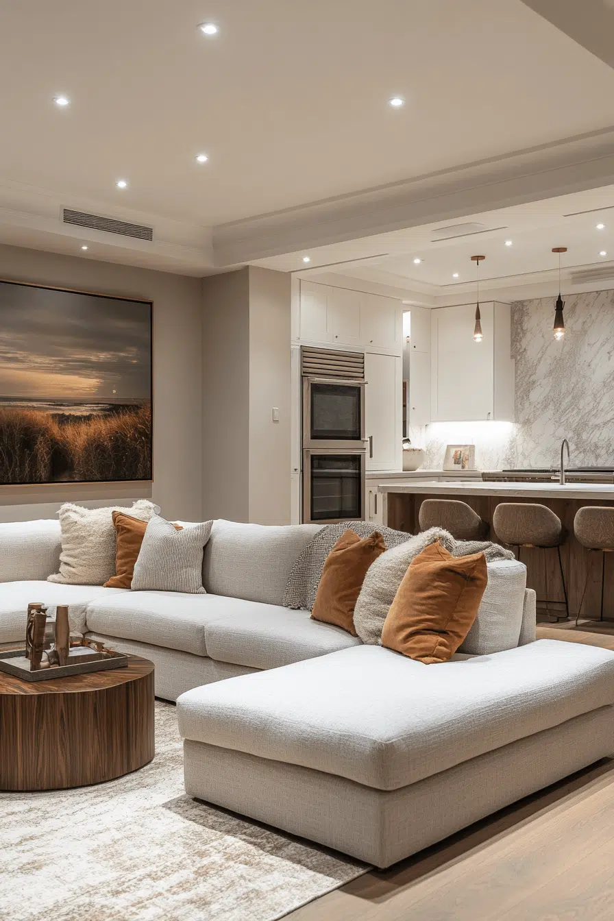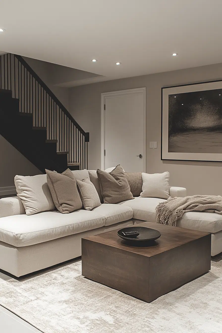 Clean aesthetics shine through basement family room ideas grounded in minimalism. Neutral tones calm the space. Modular furniture supports adaptability. Visual clarity enhances comfort. Simplicity elevates function. Discover minimalist basement inspiration today!