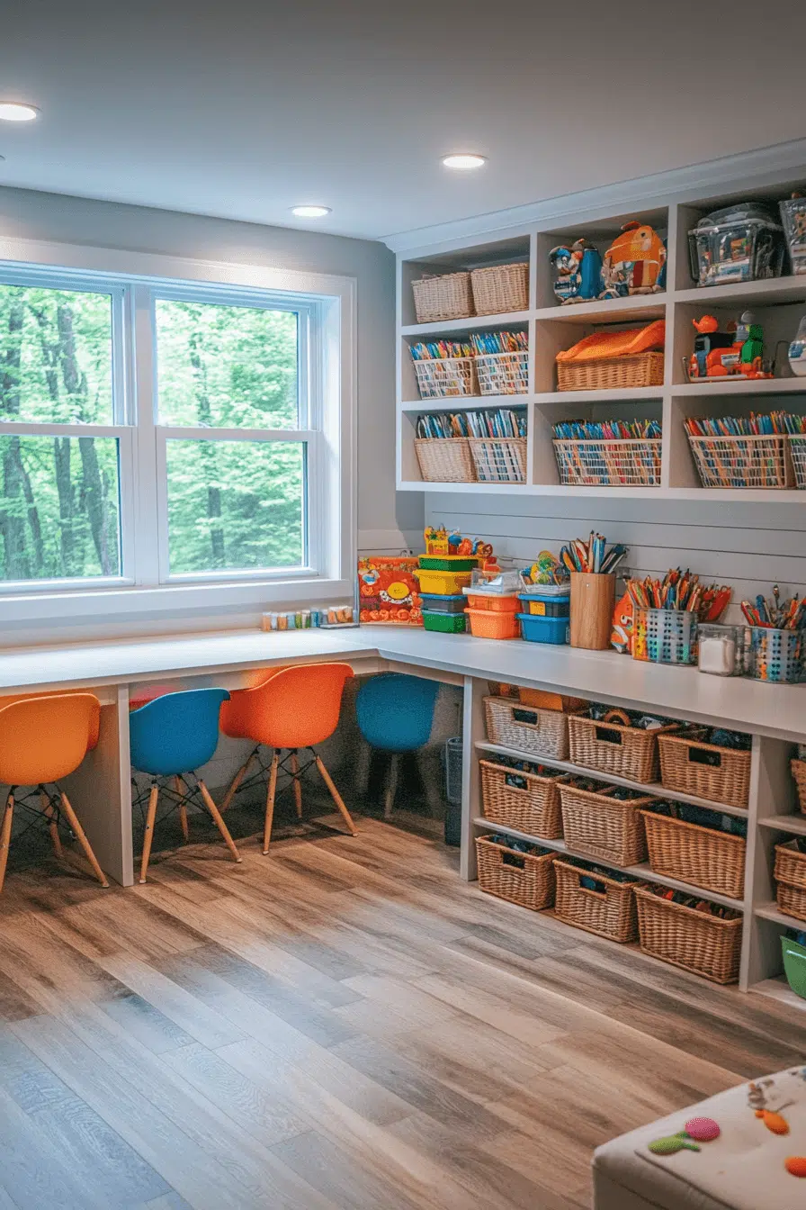 Creative energy flourishes with basement family room ideas that support artistic expression. Balanced lighting and organized storage make projects stress-free. Washable surfaces simplify cleanup without limiting creativity. The space invites exploration and imagination. Family creativity thrives here. Start designing your creative basement today!