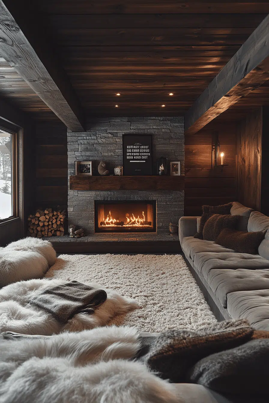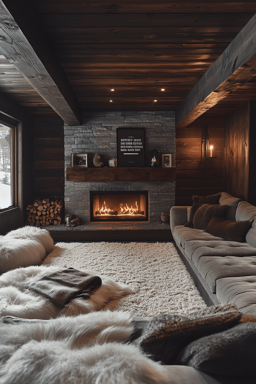 Organic textures bring character to lower levels through basement family room ideas inspired by rustic comfort. Natural wood tones, stone accents, and warm colors ground the design beautifully. Soft lighting enhances depth and visual interest. The room feels welcoming without appearing heavy. This style suits relaxed gatherings perfectly. Discover rustic basement charm today!
