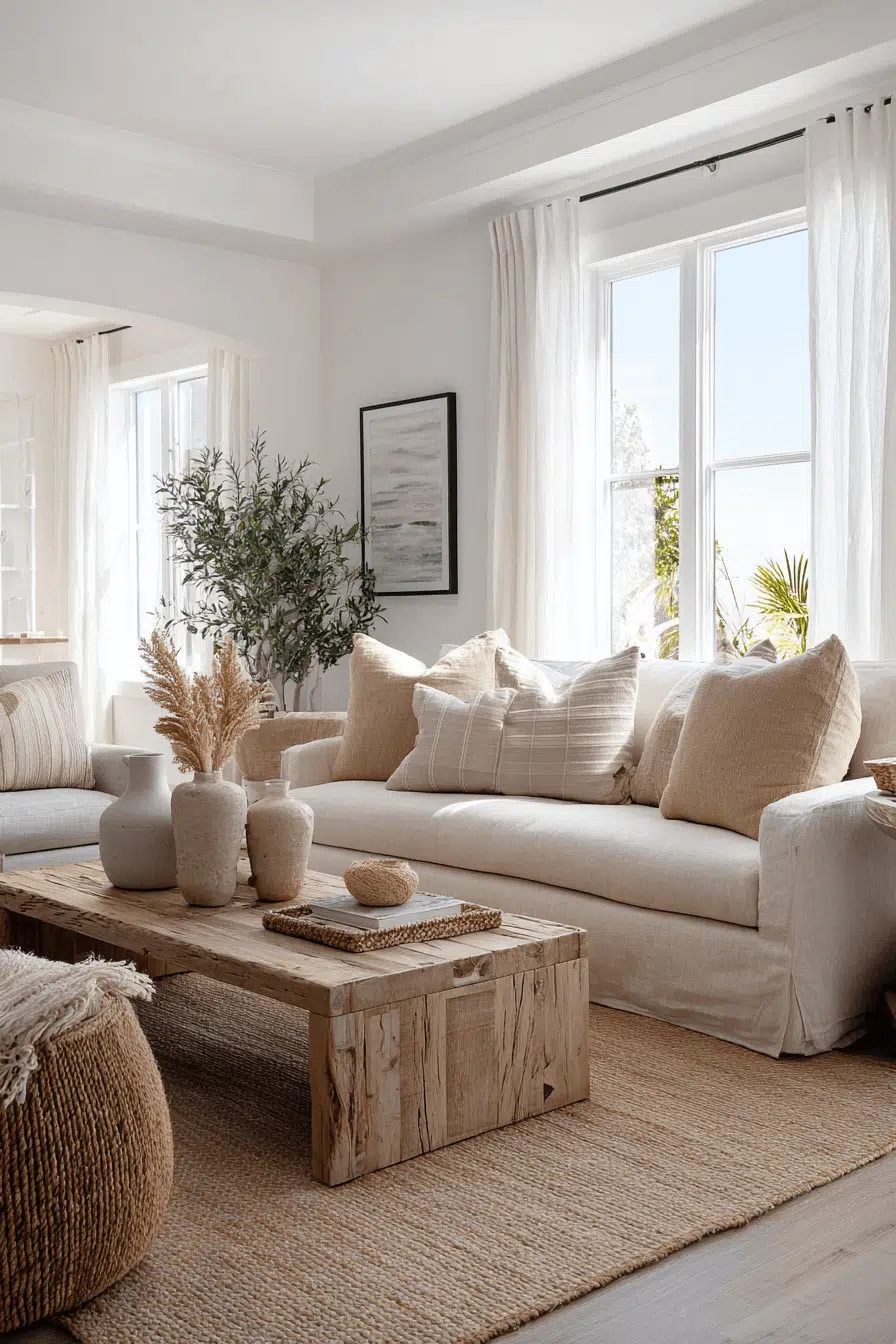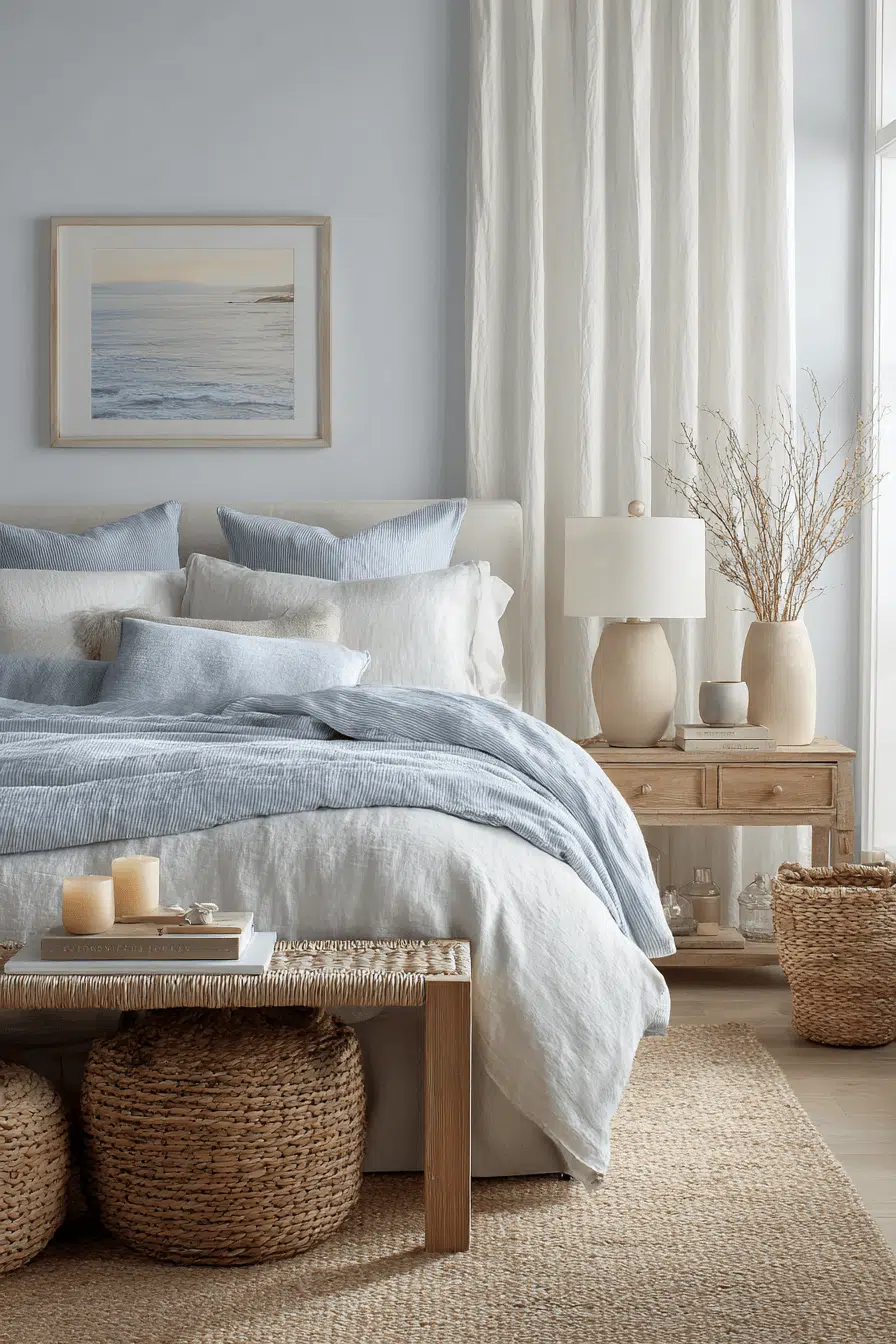 Relaxed linen layers bring softness and movement into thoughtfully curated beach house decor. Slipcovered seating, breezy curtains, and airy bedding create comfort without heaviness. This approach works because beach house decor thrives on breathable, natural materials. Linen’s gentle texture adds depth while still feeling polished. Pair it with light woods and subtle blue accents for harmony. Tap to soften your space with coastal-inspired fabric.