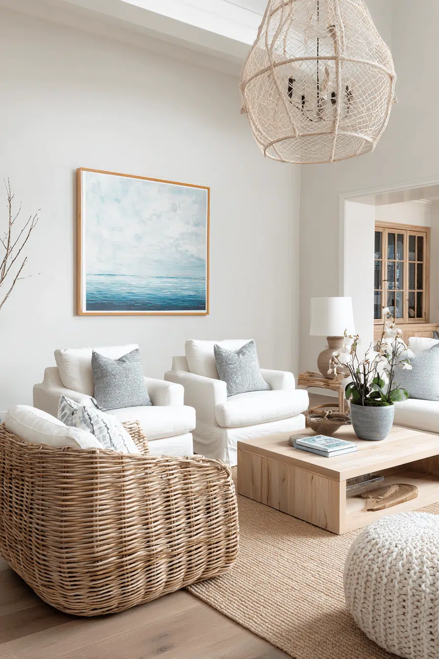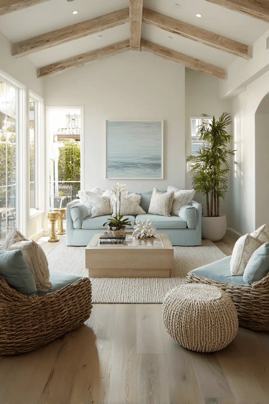 Rope and rattan details introduce handcrafted texture into beach house decor. Woven lighting, rope mirrors, and natural fiber seating add dimension without heaviness. These elements align beautifully with relaxed coastal living. Their airy structure keeps the room feeling light. Pair with soft textiles and pale tones. Tap to weave natural texture into your design.