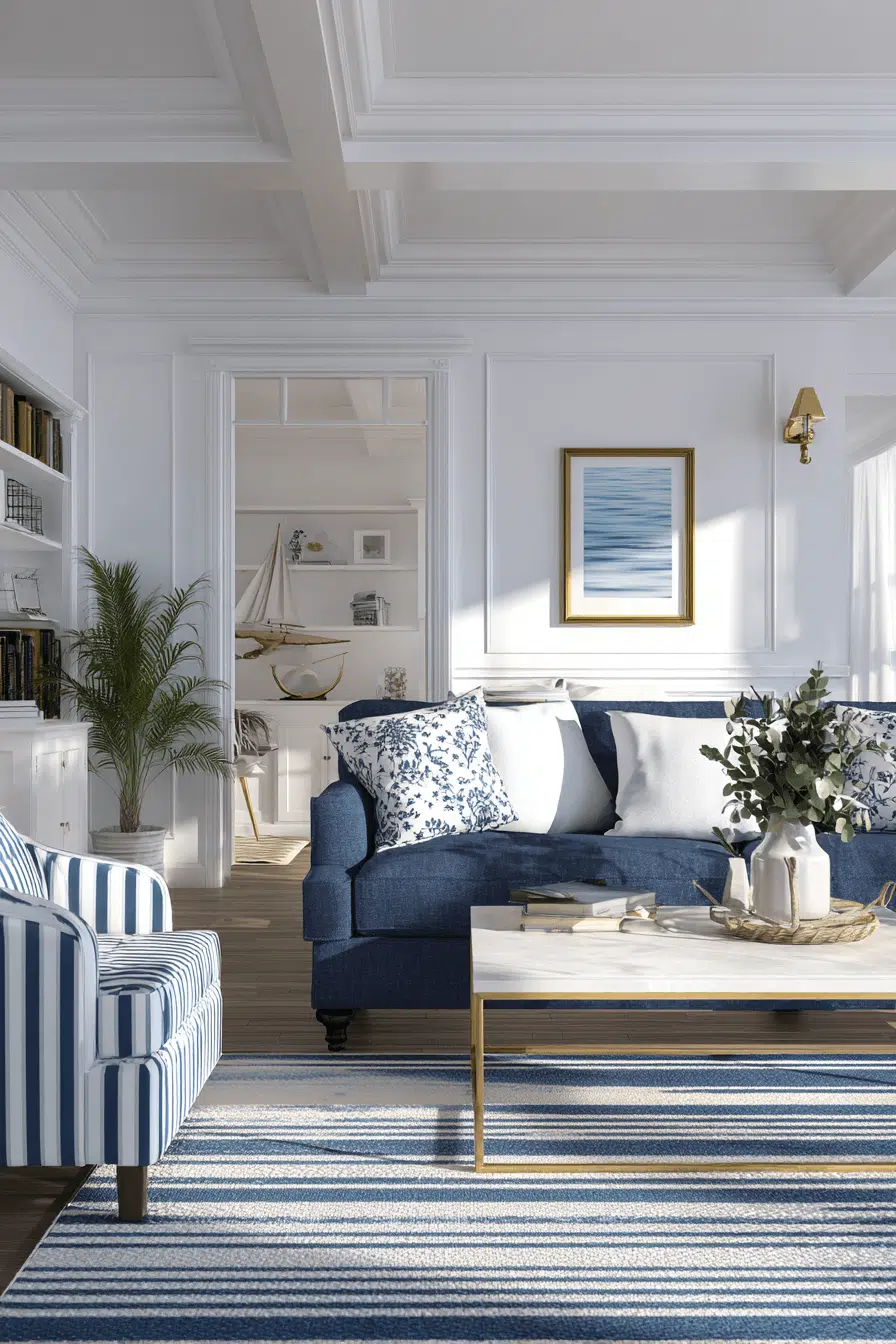 Classic maritime accents refine beach house decor with subtle structure. Navy stripes, tailored furniture, and restrained nautical motifs create balance. This approach prevents the space from feeling overly themed. Polished chrome or brass touches add sophistication. Keep colors cohesive and patterns controlled. Click to bring timeless nautical polish into your coastal home.