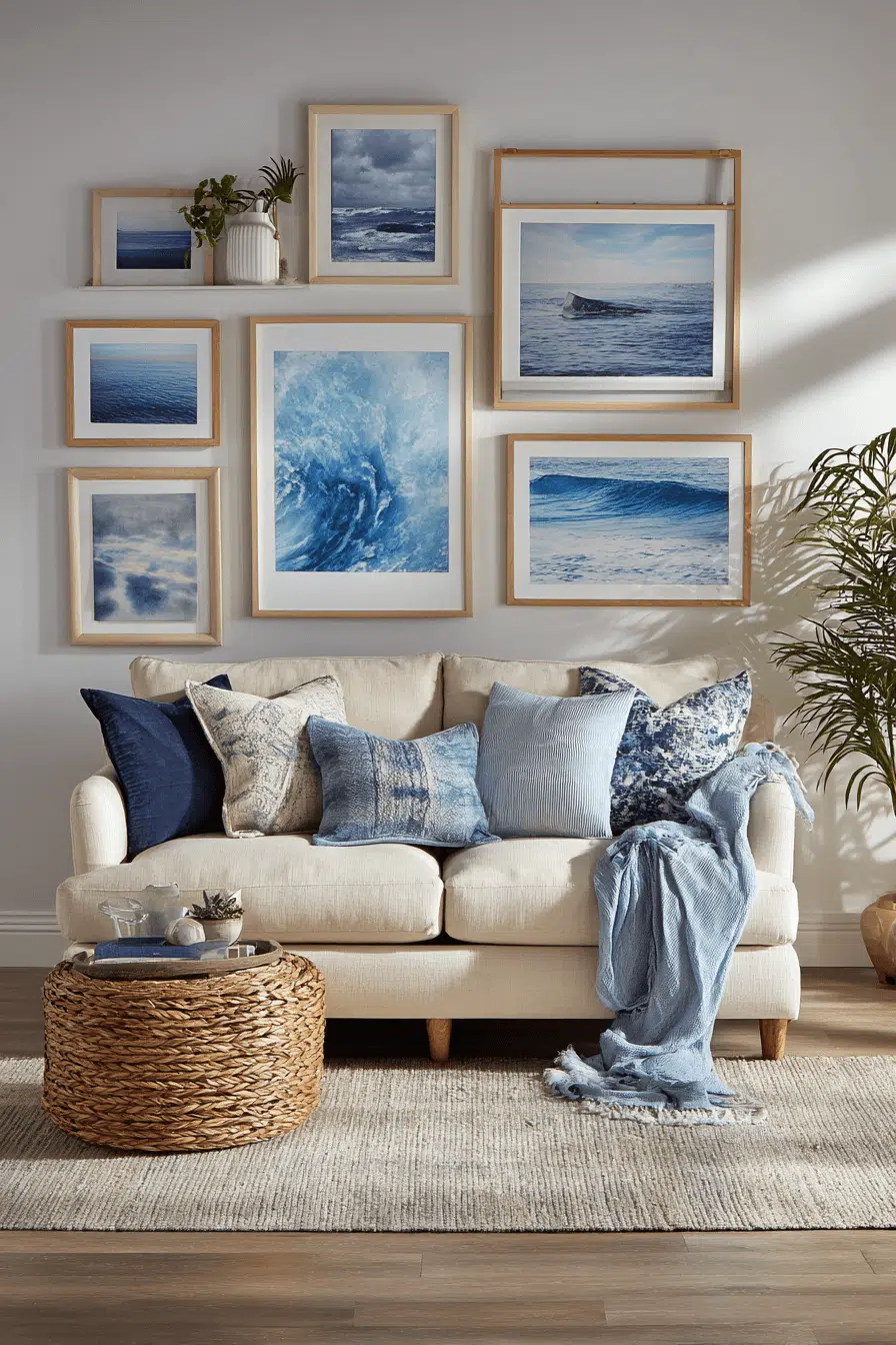 A curated coastal art collection adds depth and storytelling to beach house decor. Seascapes, abstract blues, and shoreline photography create visual interest. Consistent framing keeps the arrangement cohesive. Balanced layouts ensure a polished finish. This approach reflects the beauty of the surrounding environment. Tap to craft a gallery wall that celebrates seaside living.