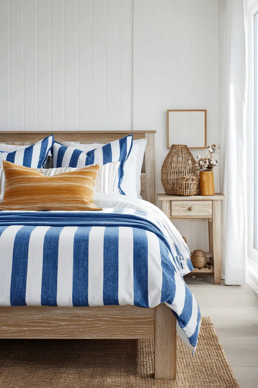 Resort-style stripes energize beach house decor with playful movement. Cushions, rugs, or bedding featuring clean lines evoke cabana charm. The structured pattern pairs effortlessly with relaxed textures. Keep the palette within coastal blues and sandy tones. Balance stripes with solids for harmony. Click to add vacation-ready flair to your home.