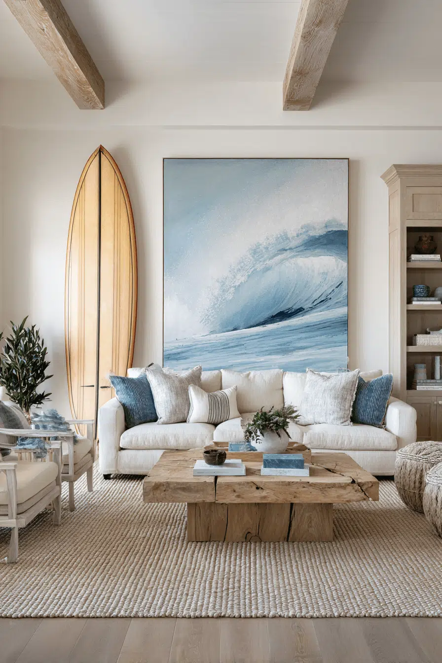 A surfboard statement wall injects personality into beach house decor. Mounted boards double as sculptural art while celebrating coastal culture. Neutral surroundings allow the focal point to shine. This works because beach house decor embraces authentic lifestyle touches. Keep décor minimal around the statement piece. Tap to turn surf style into standout design.