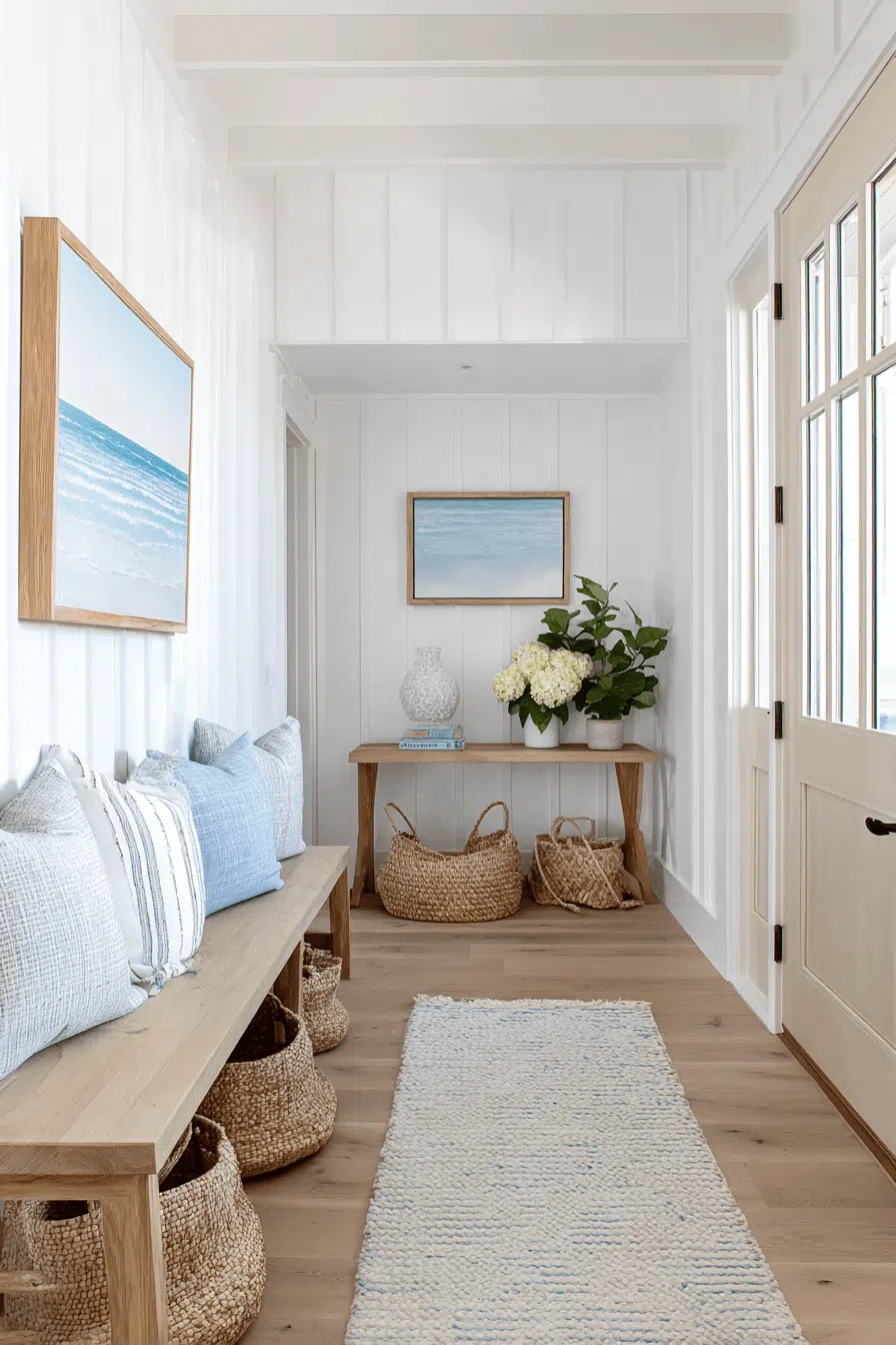 A breezy harbor entry welcomes guests into inviting beach house decor. Light wood seating, woven baskets, and soft blue details set the tone. Functional hooks blend seamlessly into the aesthetic. Keep the space uncluttered and open. Subtle art adds personality. Click to refresh your entryway with coastal ease.
