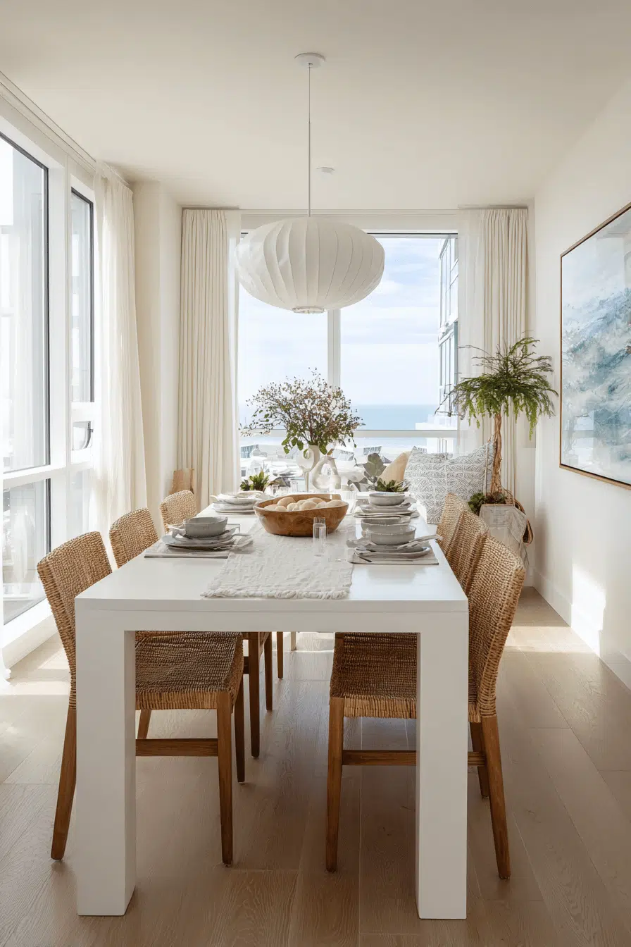 Light coastal dining pairs clean-lined tables with woven seating in modern beach house decor. Linen runners and soft lighting enhance warmth. The mix of simplicity and texture feels relaxed yet refined. Keep colors cohesive and bright. This creates a welcoming dining atmosphere. Tap to elevate your seaside meals with effortless style.